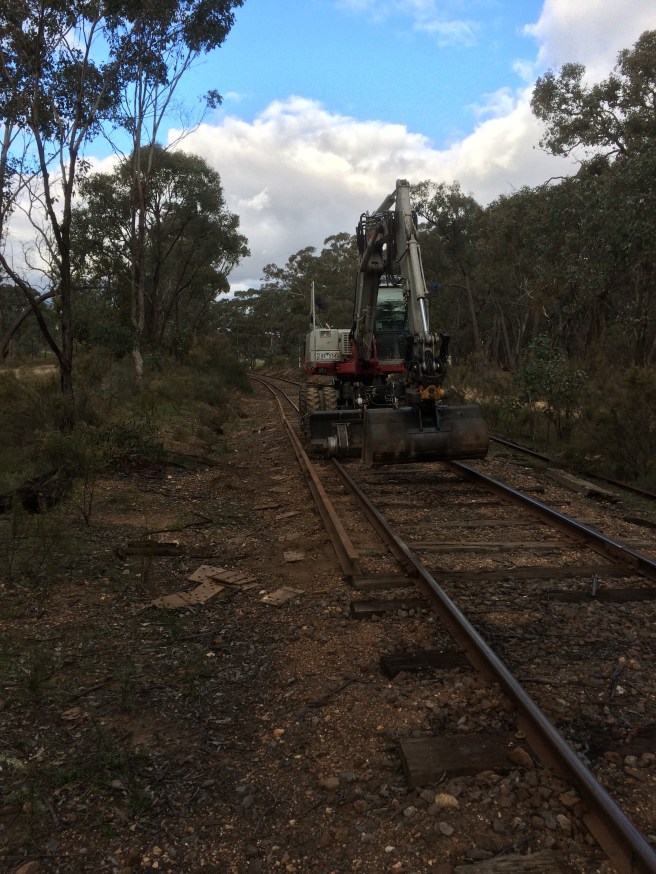 The curve between Muckleford Creek Bridge and Donkey Farm Track. Previously the high leg had been re-railed with this work on the low leg.