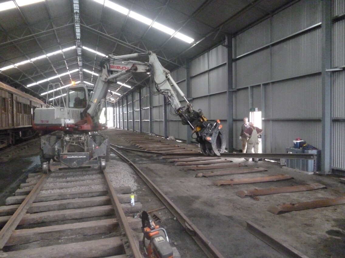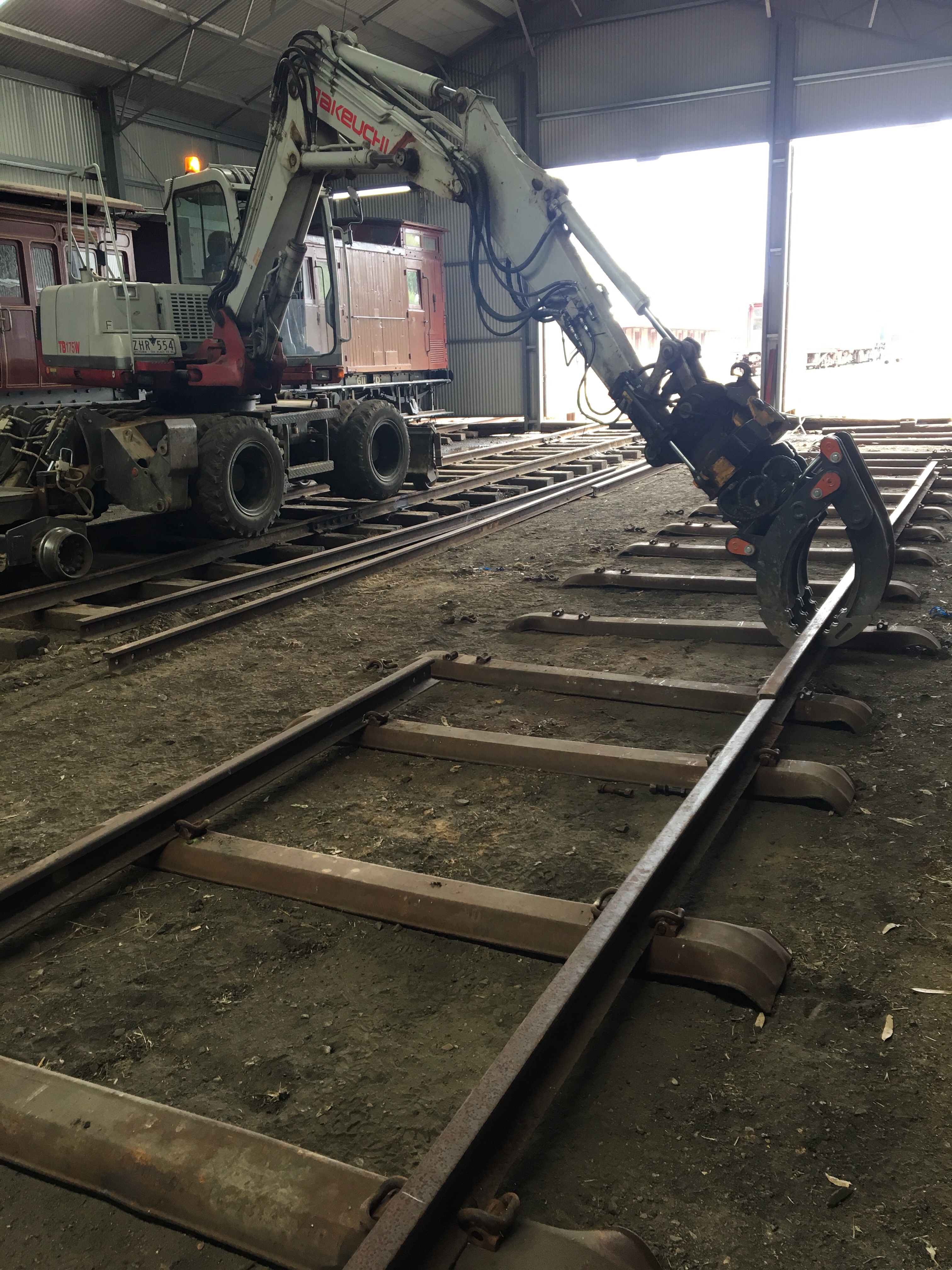 Using the new grab on the excavator to lift the rails onto the sleepers – previously there would have been a lot of baring required.