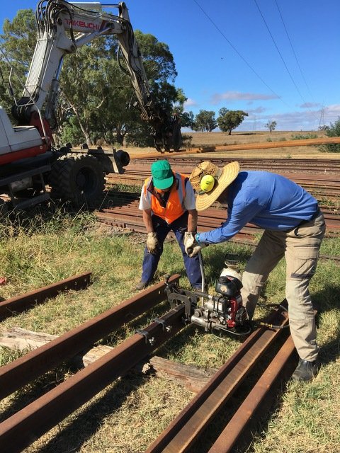 While the rails are being drilled and or cut you can see the excavator sorting rails. Here Rolf & Malcolm are drilling holes in the end of a rail (for fishplate bolts)