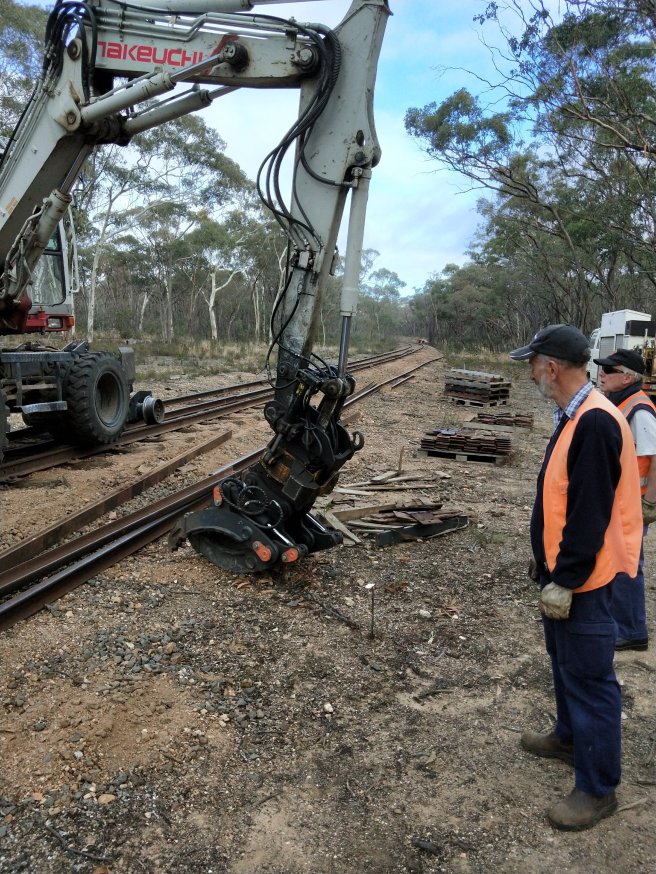We distributed the sleeper plates, seen to the right of the right hand rail, removed anchors and unbolted the steel sleepers, which well and truly used up the afternoon. The pic above shows us collecting anchors.