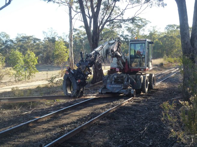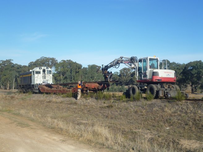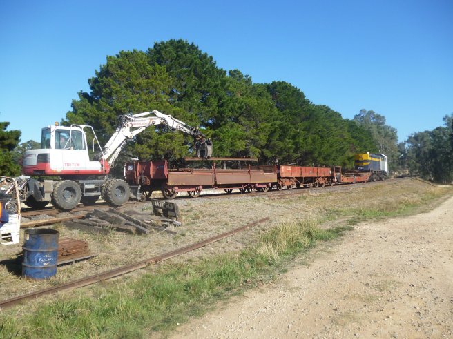 The excavator can handle all the loading with no other intervention required. The motley collection of rolling stock is just due to the order of the stock stored at Muckleford, easier to grab the lot than shunt out just the one wagon.
