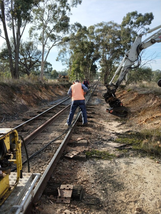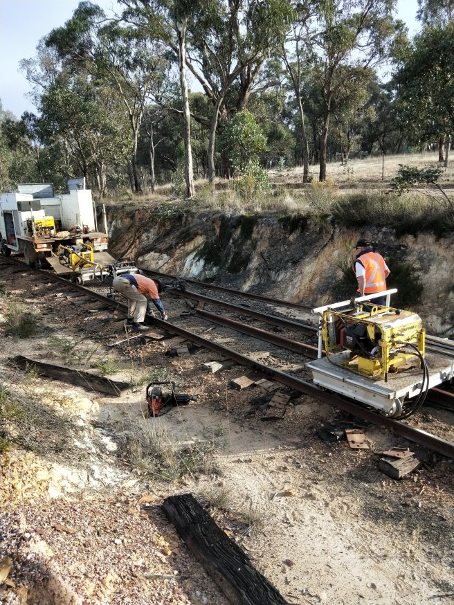 Today saw an incredible achievement, with 27 x 80lb rails installed, spiked 1 in 3, in the down leg of tangent 14-15 (near Muckleford Creek Bridge).