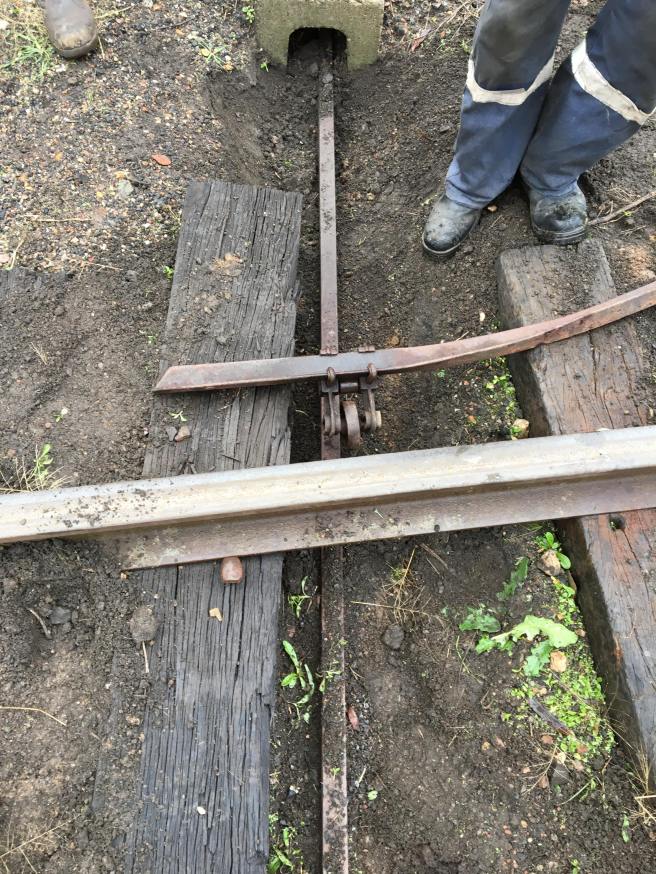 The point rodding to turnout no. 28 was slightly buried and unsupported causing unnecessary friction with the ground, so the gang re-installed the angle bracket which had been re-moved during works some years ago. They also dug out around the rodding, clearing weeds and dirt accumulated over the years.