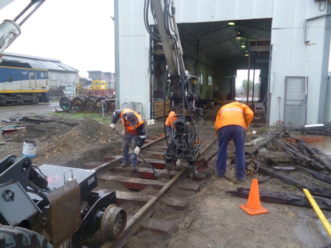 The rain really set in after lunch, here the gang is jacking the new track ready for tamping, normally a simple task but made rather uncomfortable by the pouring rain.