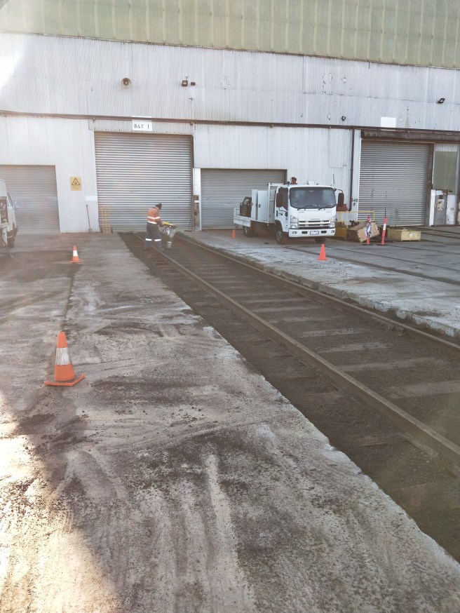 Ian from the workshops spent the day on a jumping jack compacting the rock around the sleepers ready for the concrete pour.