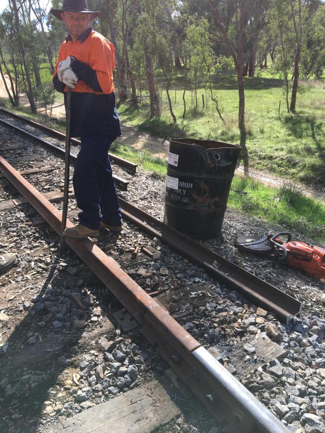 Here Colin admires the joining of the newly installed rail to the existing 80lb over the bridge.