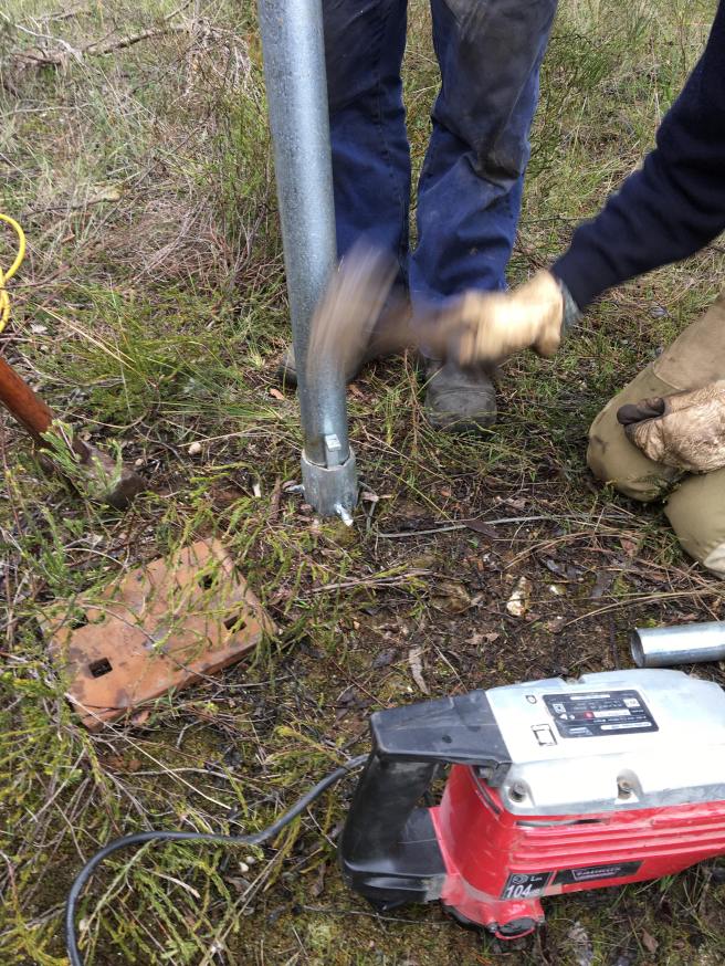 The post holding the sign is then inserted into the spike and secured by a locking pin. Seen here being driven home.