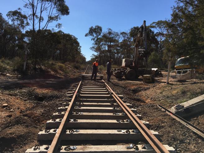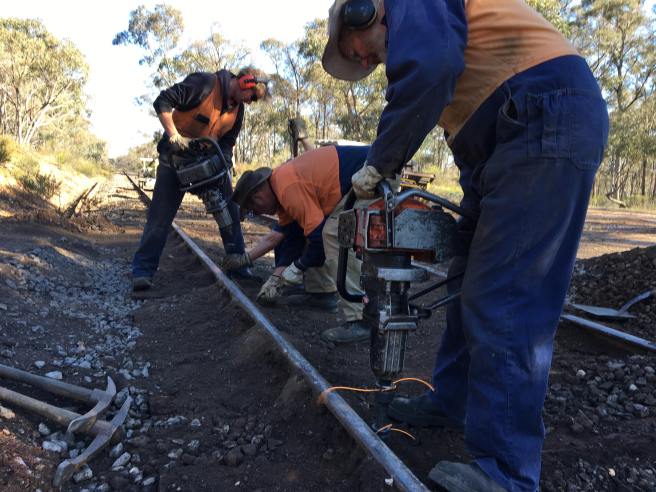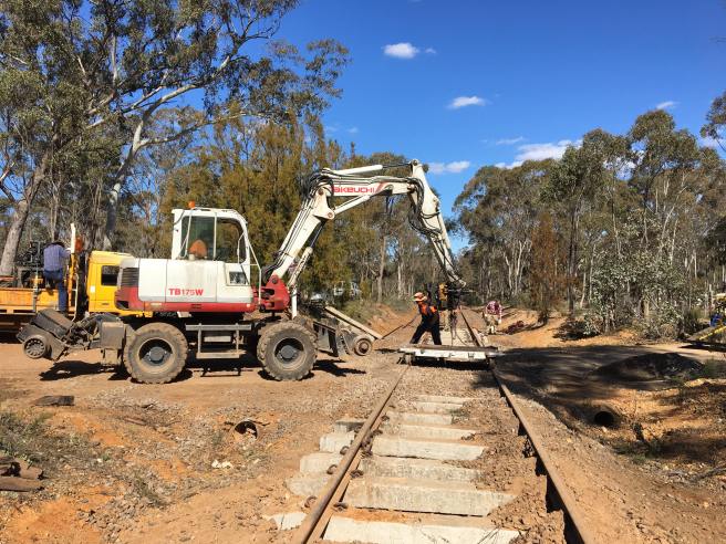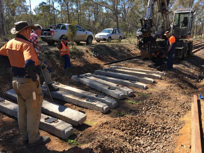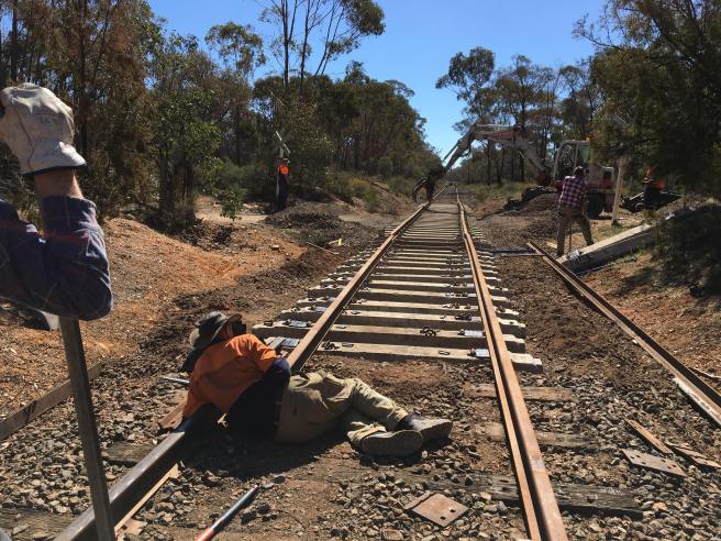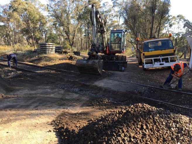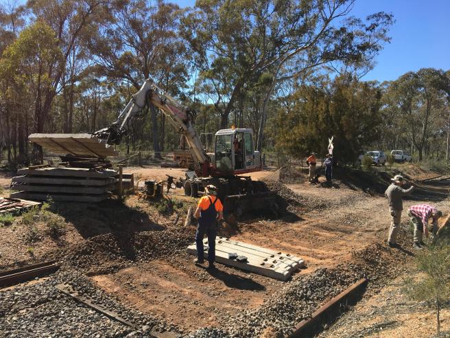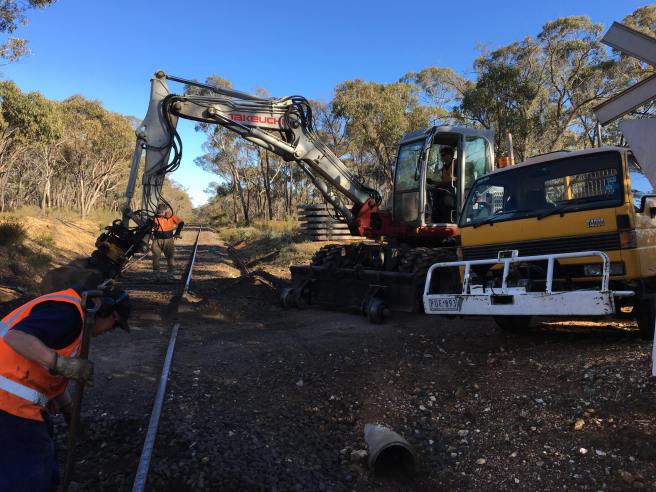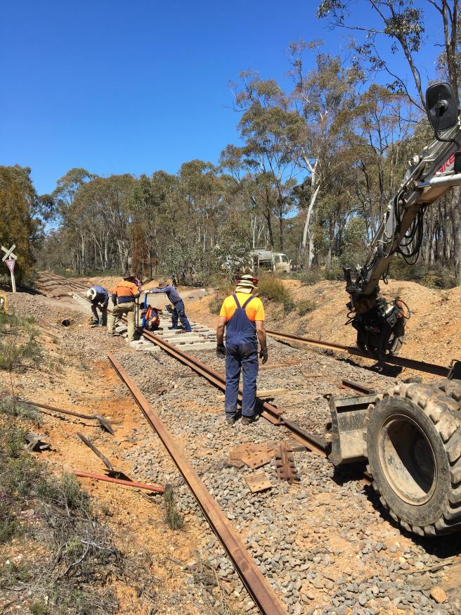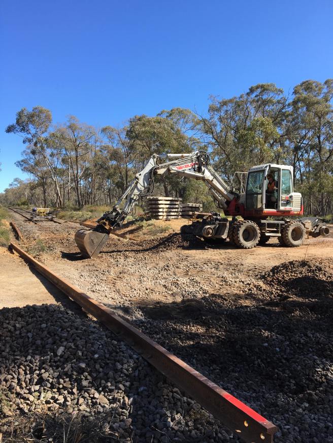 By afternoon tea we’d reached this point, all new sleepers from the crossing towards Maldon were fastened up. Here John sights along the rail, calling to Will in the excavator (via radio), to gently remove that slight kink in the track. Quite a job for the digger given the weight of all those sleepers.