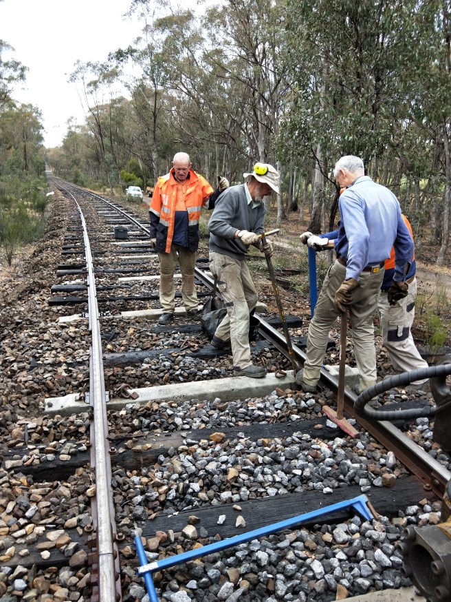 One of the joys of clipping up the concrete sleepers is there’s no noisy equipment! It’s also a fairly easy task with this many people, meaning you can plug away at a steady pace for hours. John, Rolf, Neville and Trevor had by now got the system of clipping down to a fine art.