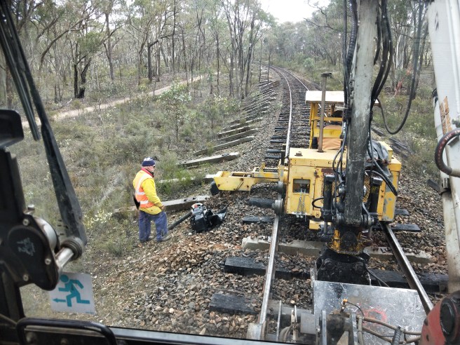 Tamping up the recently inserted sleepers to make the clipping up process much easier.