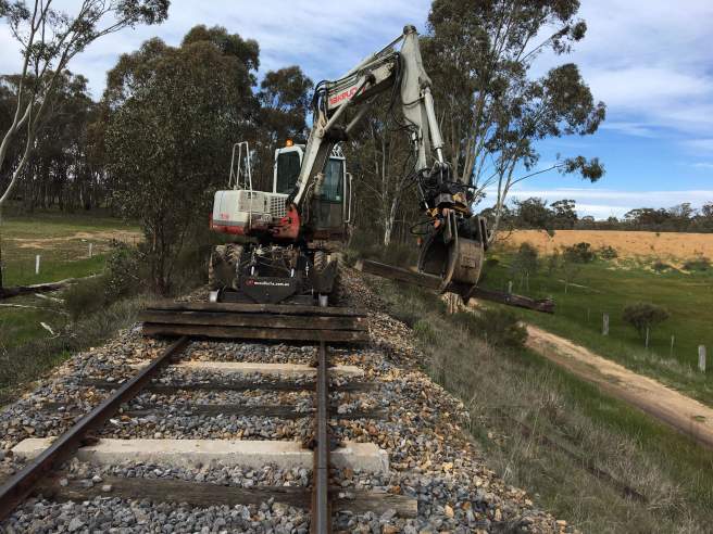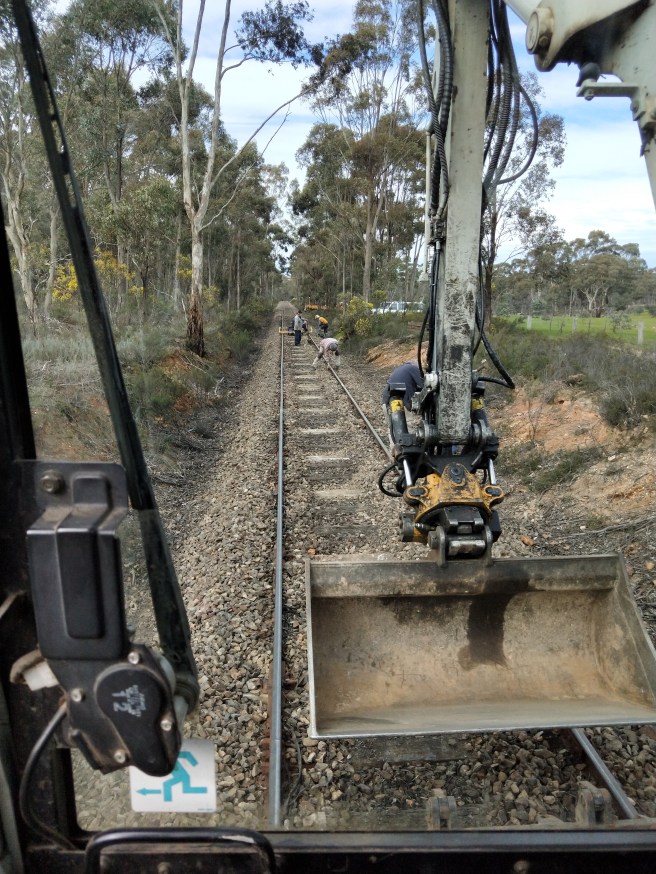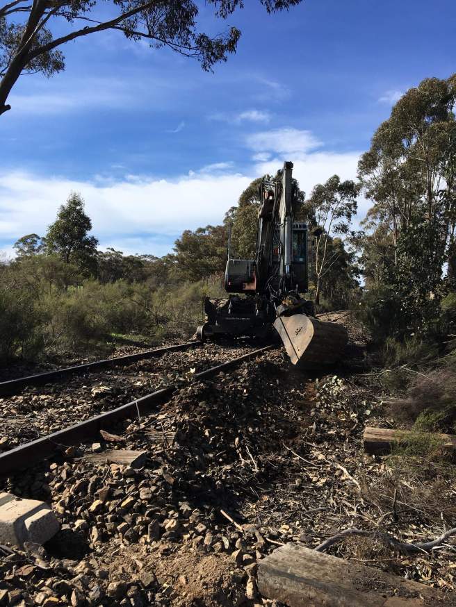 The digger was hot on the heels of the clippers, moving timber sleepers to stackable locations and moving the ballast around, ready for tamping.