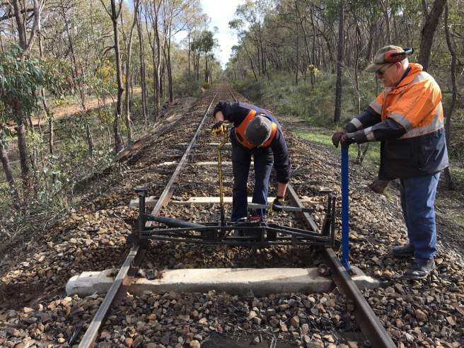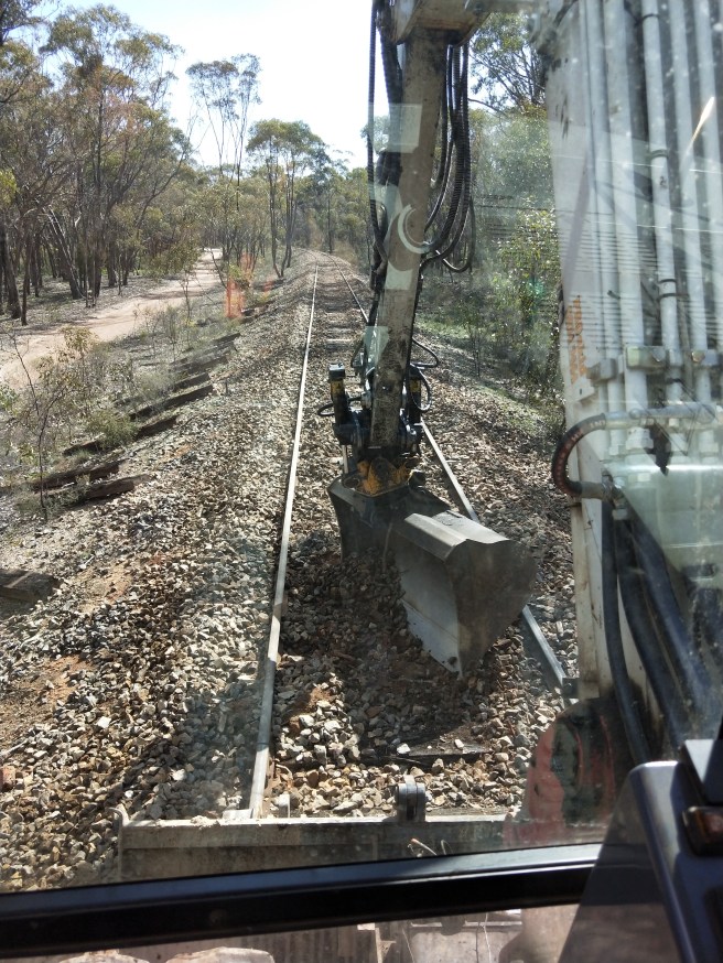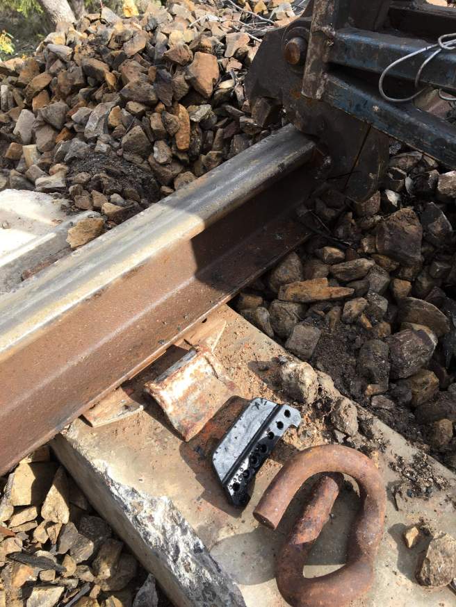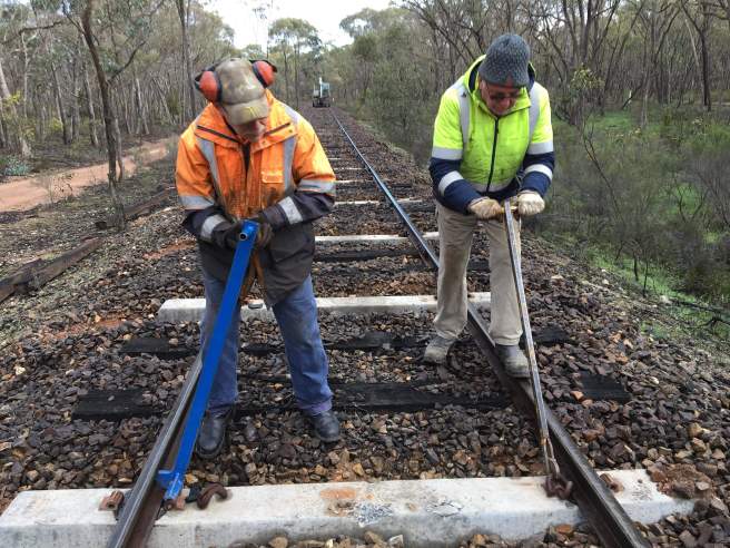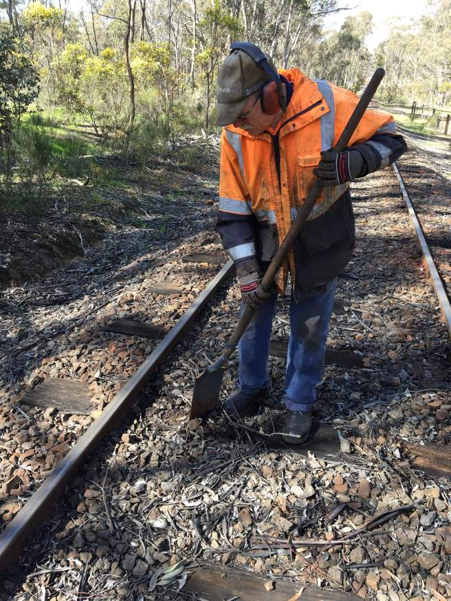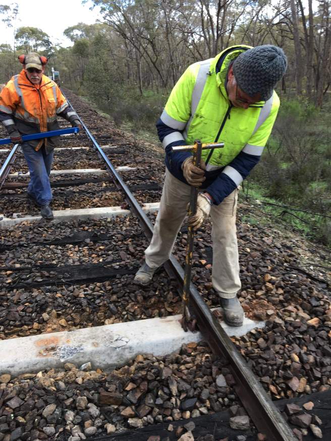 But as we’d completed the task well ahead of schedule, more work was found in the form of fastening removal in the next section. Clive and Bruce went ahead some 300 sleepers clearing the way for the spike and screw pullers. With all the required fastenings removed from curve 9 to Sawmill Road Crossing. 176 concretes are needed here (will seem like only an afternoon’s work now!)