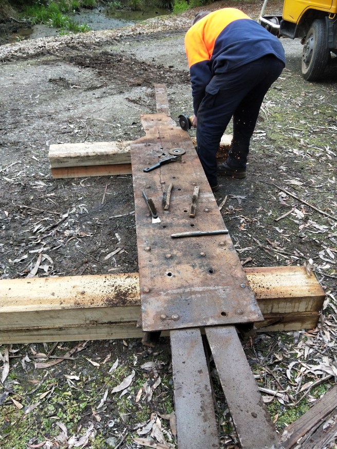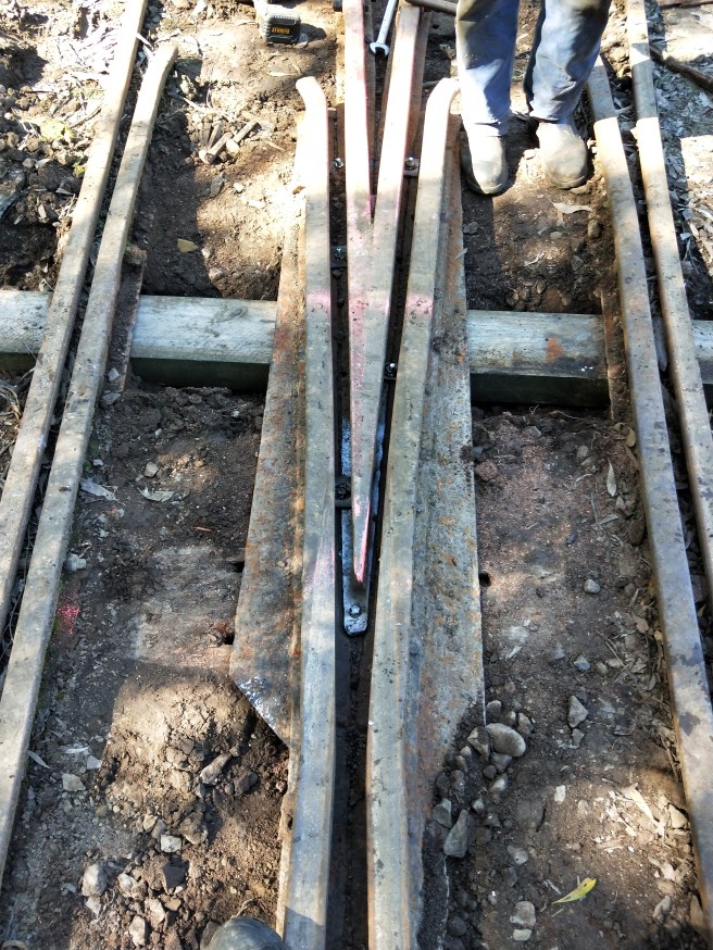 While that was going on, the excavator was busy inserting sleepers. About 110 have been inserted now, with 30 odd drilled one side and spikes started. The timbers being used are H4 treated 200×100 Treated Pine. Light weight but just as fiddly and almost identical time required as full sized sleepers.