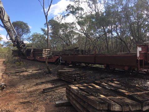 Today’s works train was about collecting all the remaining bundled timber sleepers from the Castlemaine section and transferring them to their homes along the Maldon Section.