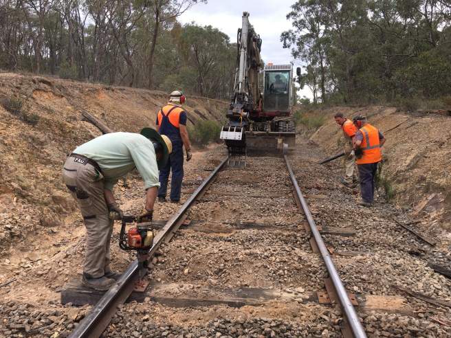 We then moved back to the start of the job, working together to install the new sleepers, sleeper plates, drilling one end and stand the spikes.
