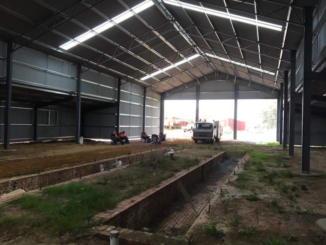 As we’d finished our clipping up by lunch time, we looked at the ominous sky and decided we’d head into Castlemaine to check out the new loco shed. It’s big and looks impressive! It’ll no doubt feature a lot in coming months as we begin track construction.