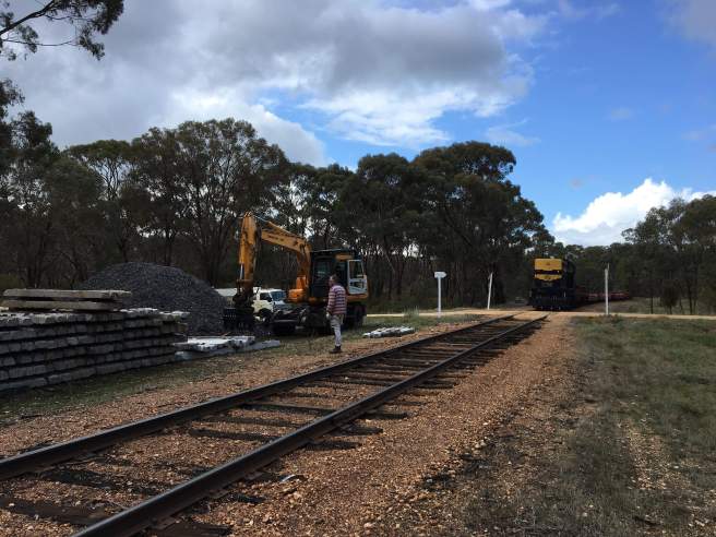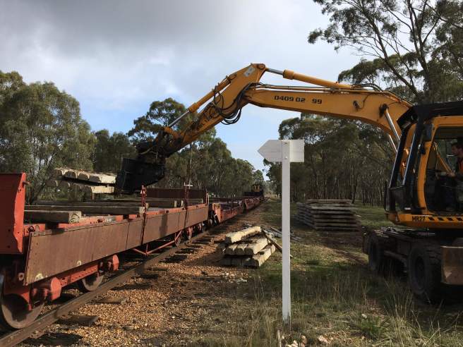 The afternoon, despite the occasional strong hail downpour, was successful. We loaded our civil train with the concrete sleepers stacked by Woodlocks Ln.