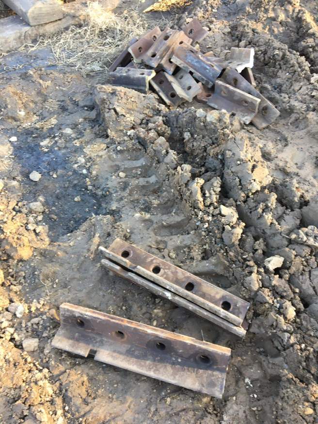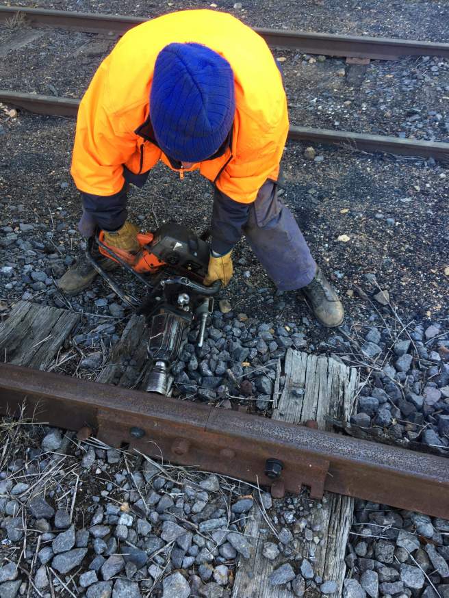 As we ran into the same fishplate problem that we always do when using concrete sleepers, we decided it was wasteful to use all of our good bar plates in the yard, so we’ve modified some of the old 80lb plates from 6 holes into 4 holes, by cutting off the end. Perfectly adequate for our needs here.