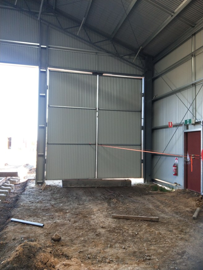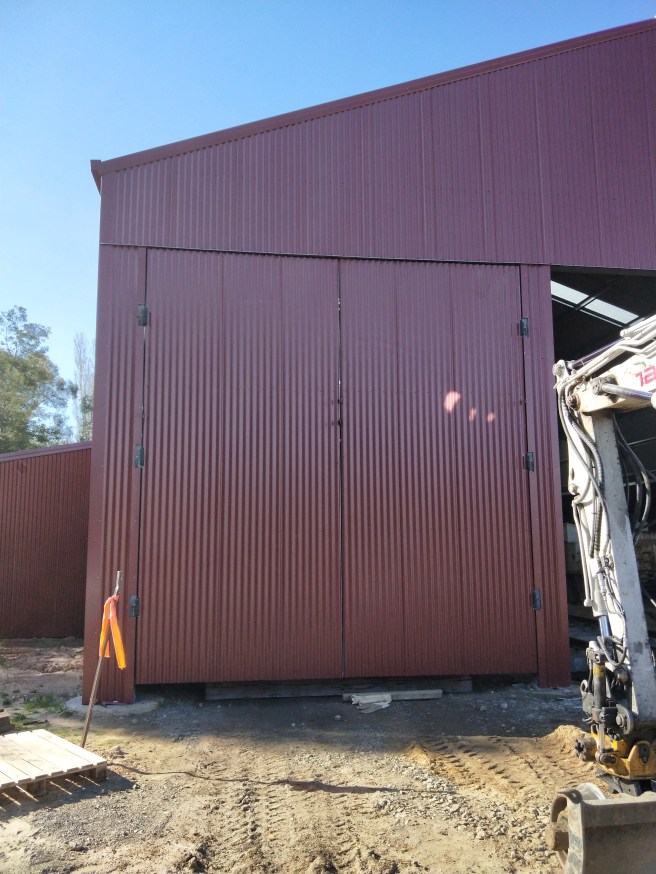 Well the greatly awaited fitting of the doors is well underway. Yesterday saw the West Track of the loco shed doors hung. Temporarily secured shut by some clever ratchet strapping.