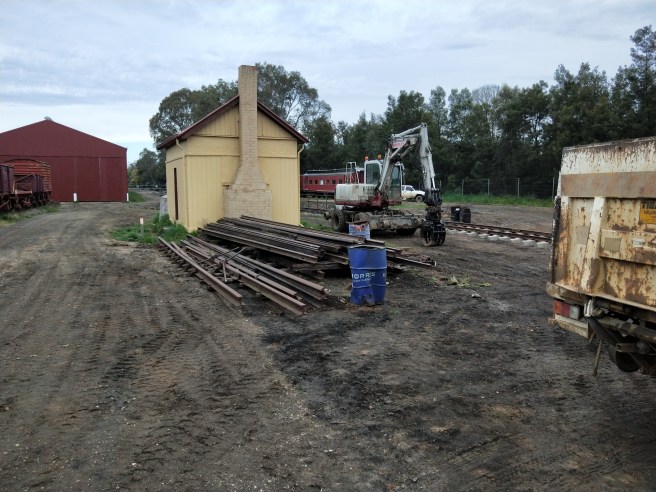 The main task of today’s gang was the removal and breaking up of rails beside the loco shed. This area is earmarked for a workshop and it’s always much easier to do the earthworks without having rails in the way.
