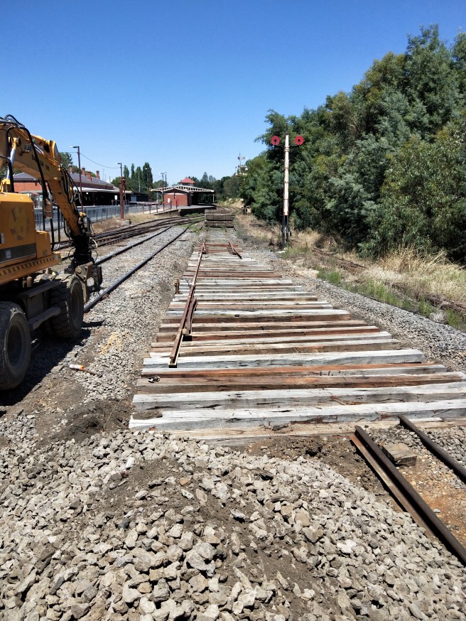 Today saw the turnout timbers spaced out and straight stock rail set on top ready for final straightening and fastening down tomorrow.