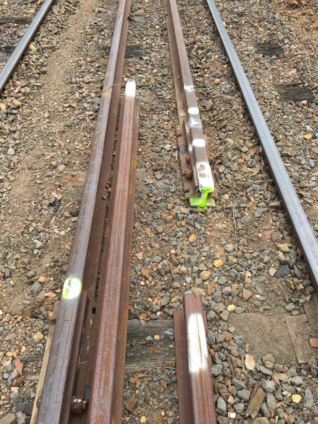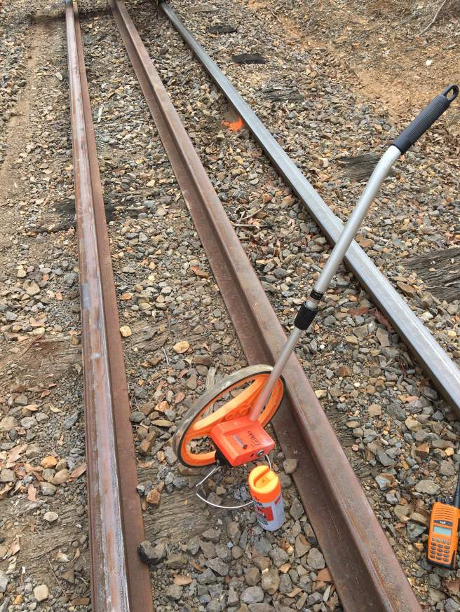 Now that we knew the exact rail lengths we are using, we set about measuring the locations we’ll need to cut and join rail, to ensure no issues. We’ll end up with 94lb through the crossing, with long junction rails on either end to get us back to the 80lb.
