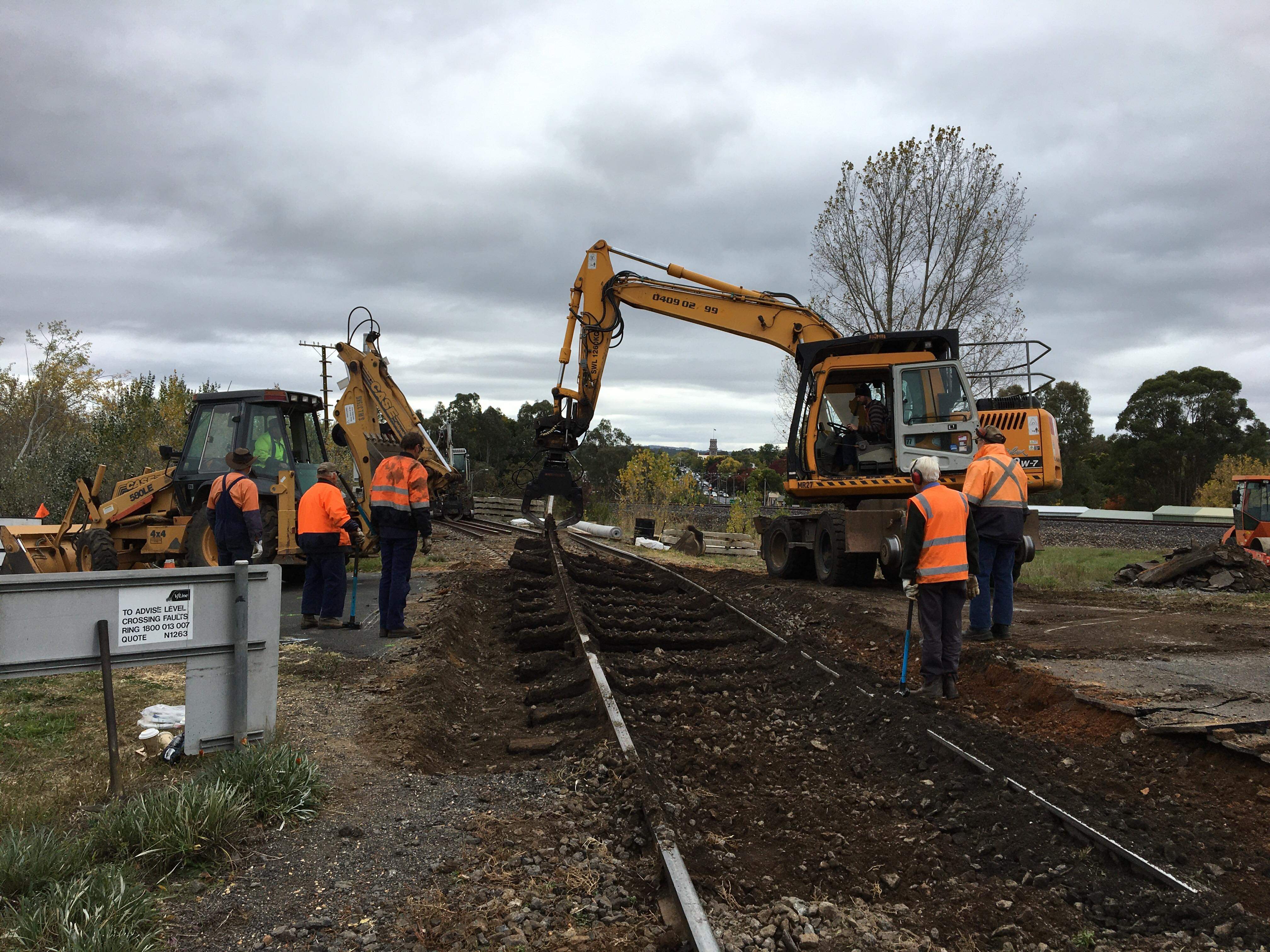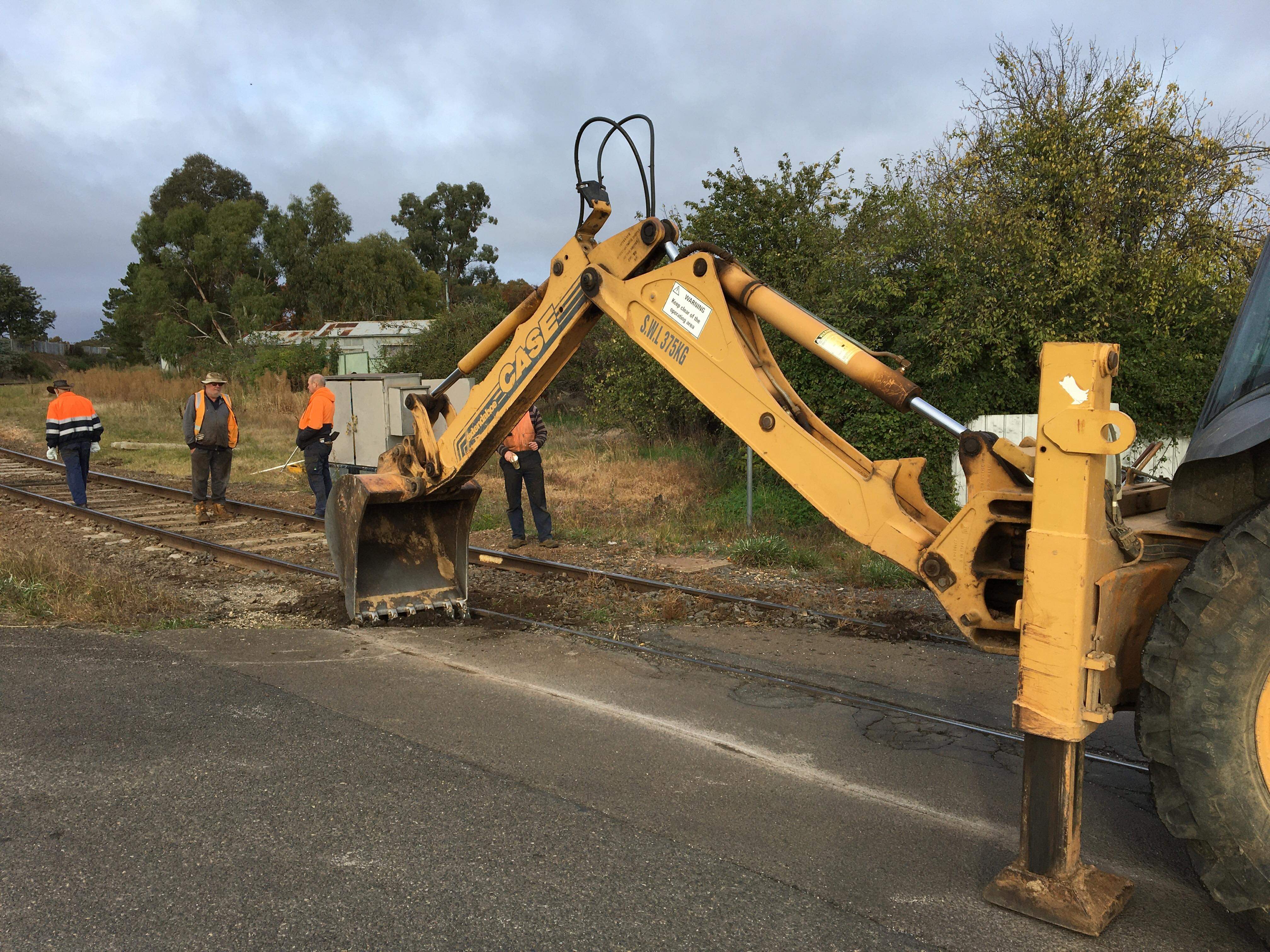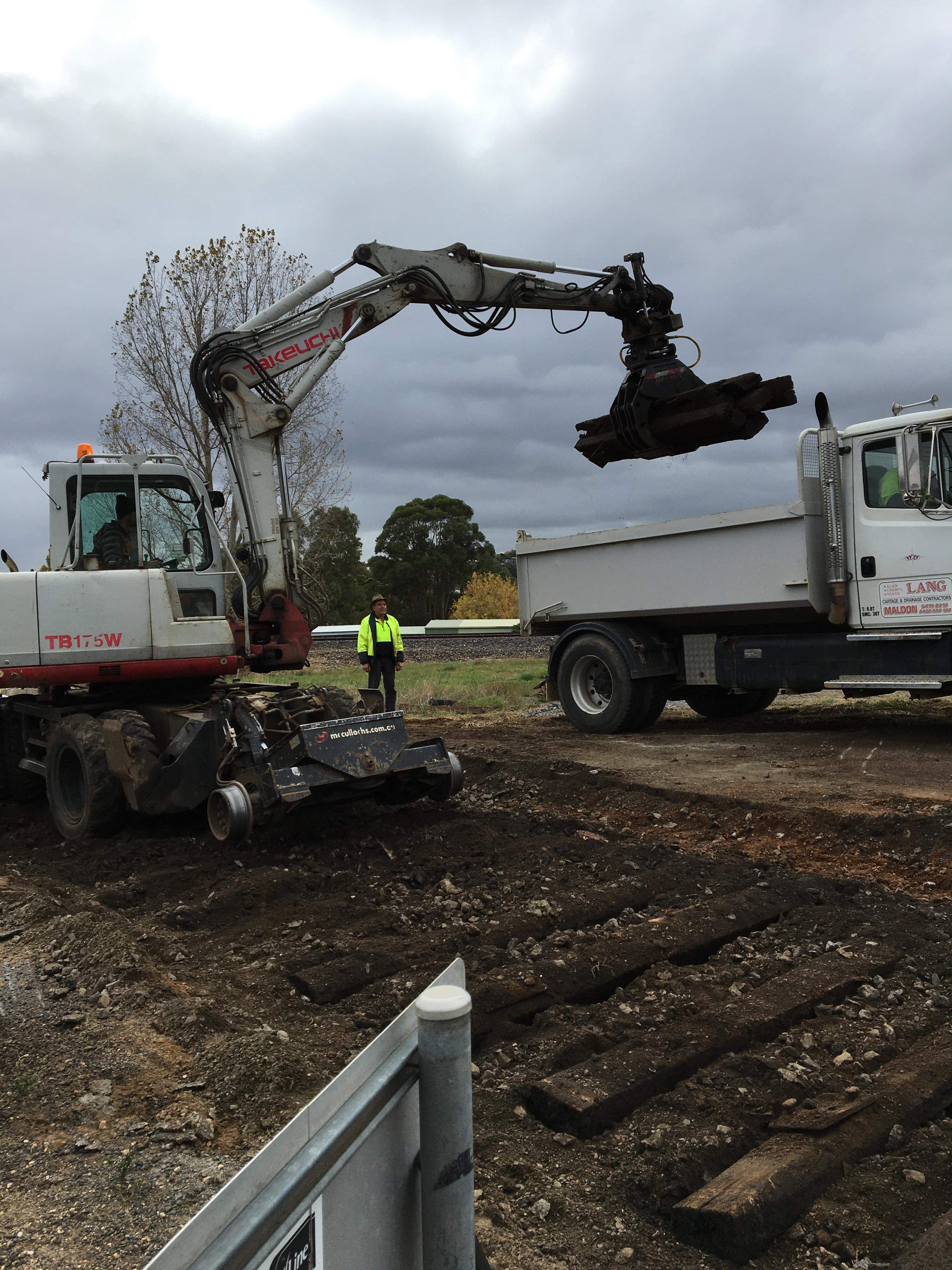 Once the crossing had been excavated to sleeper level, the big digger lifted the track, while the backhoe knocked off the old sleepers, a pretty enormous time and back saver!