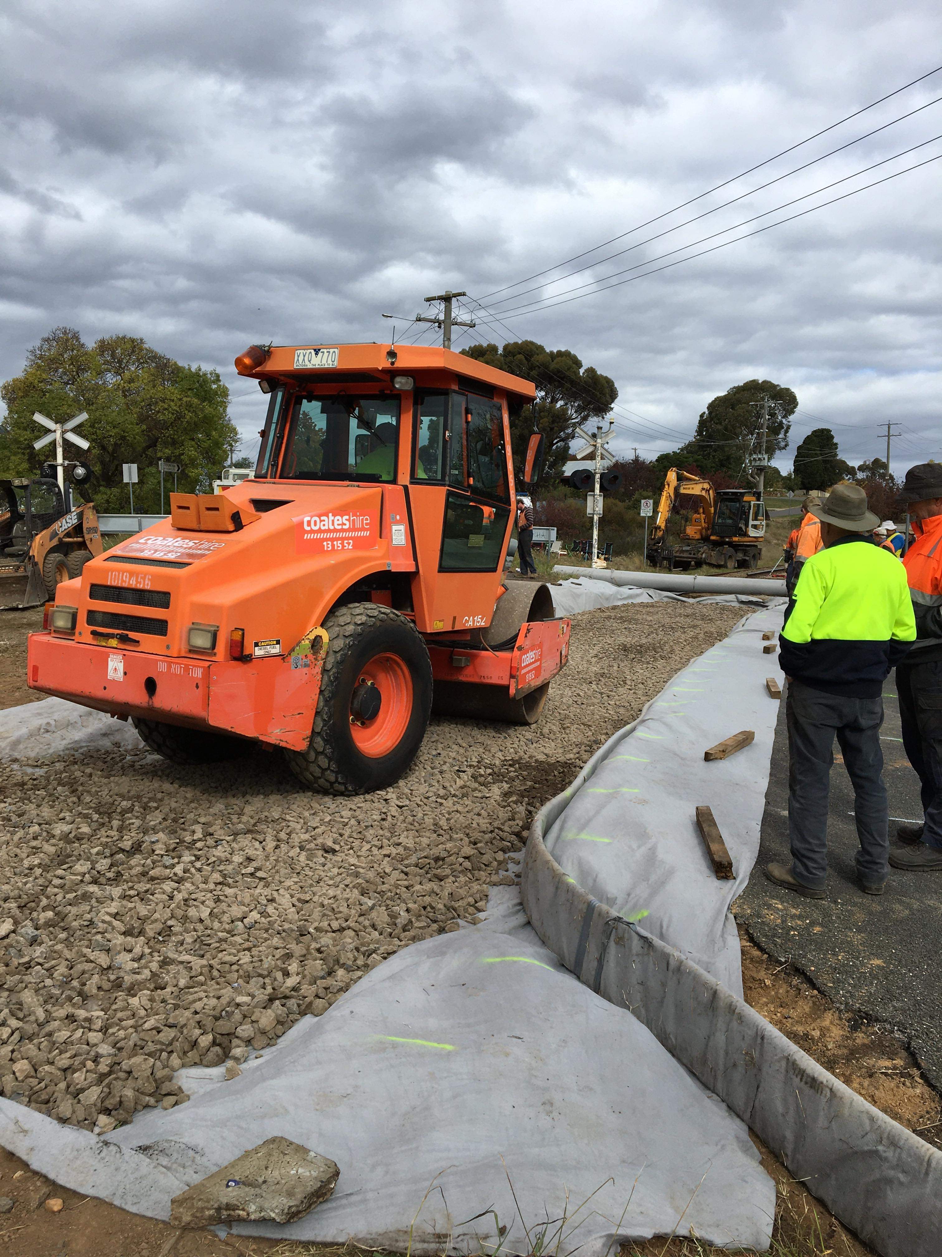 Geofab and drainage installed, with a layer of ballast to only about 50-75mm of final height was rolled in before sleepers were dropped out.