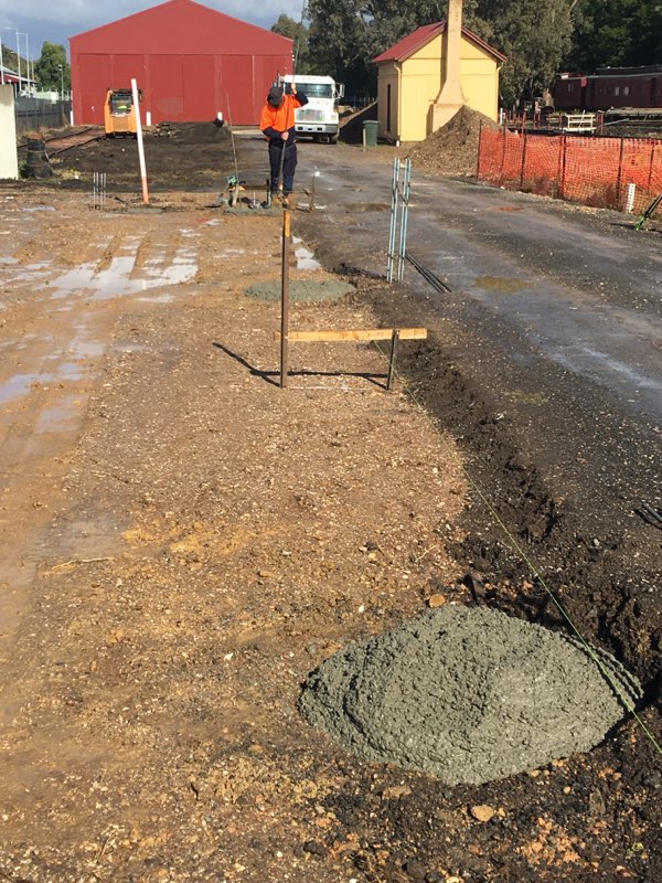 While we sheltered from the rain showers, the footings for the workshop building were drilled and the concrete poured.