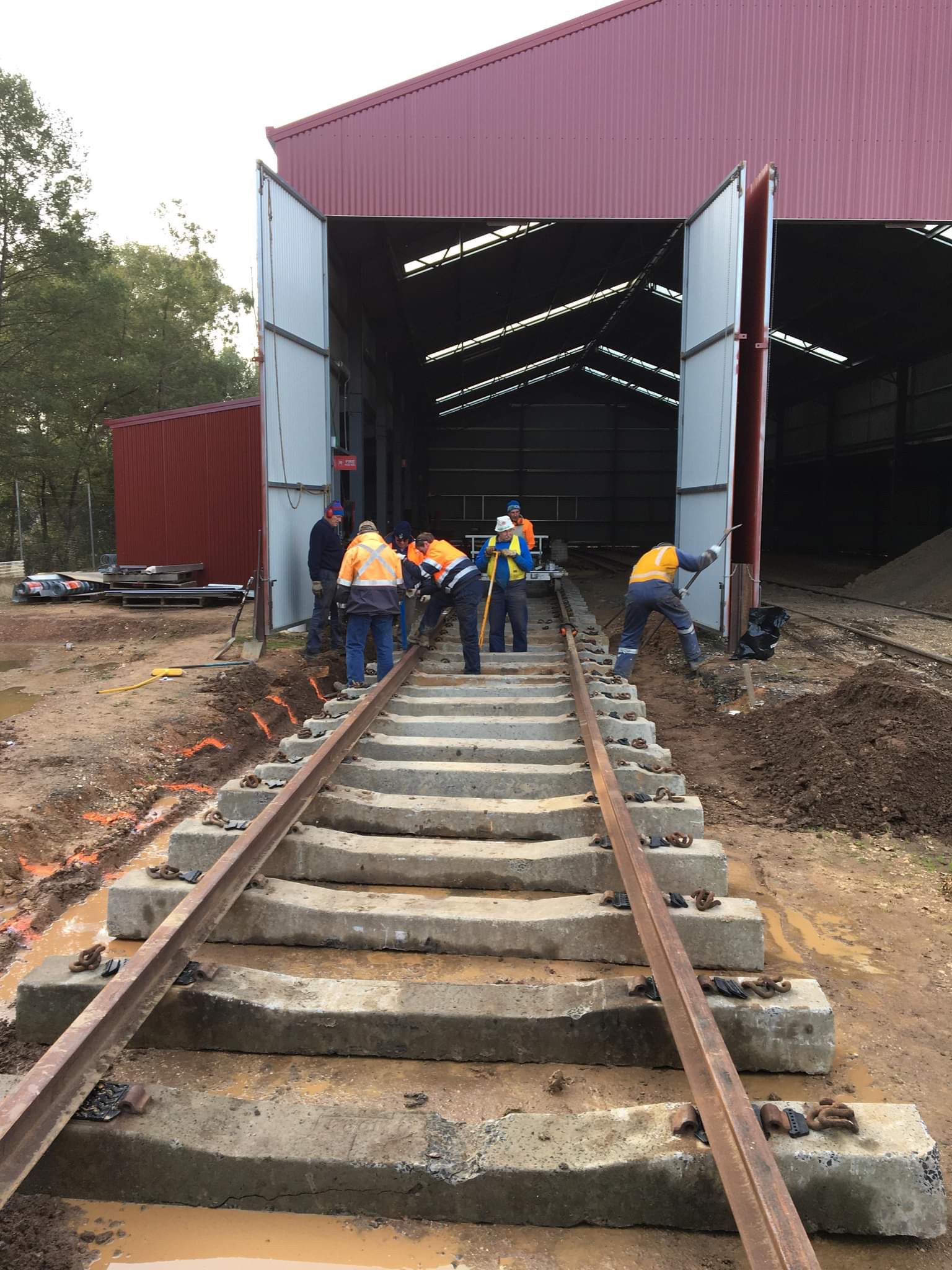 By close of play today another rail length has been loosely installed outside the shed doors, with only a few sleepers left to clip up