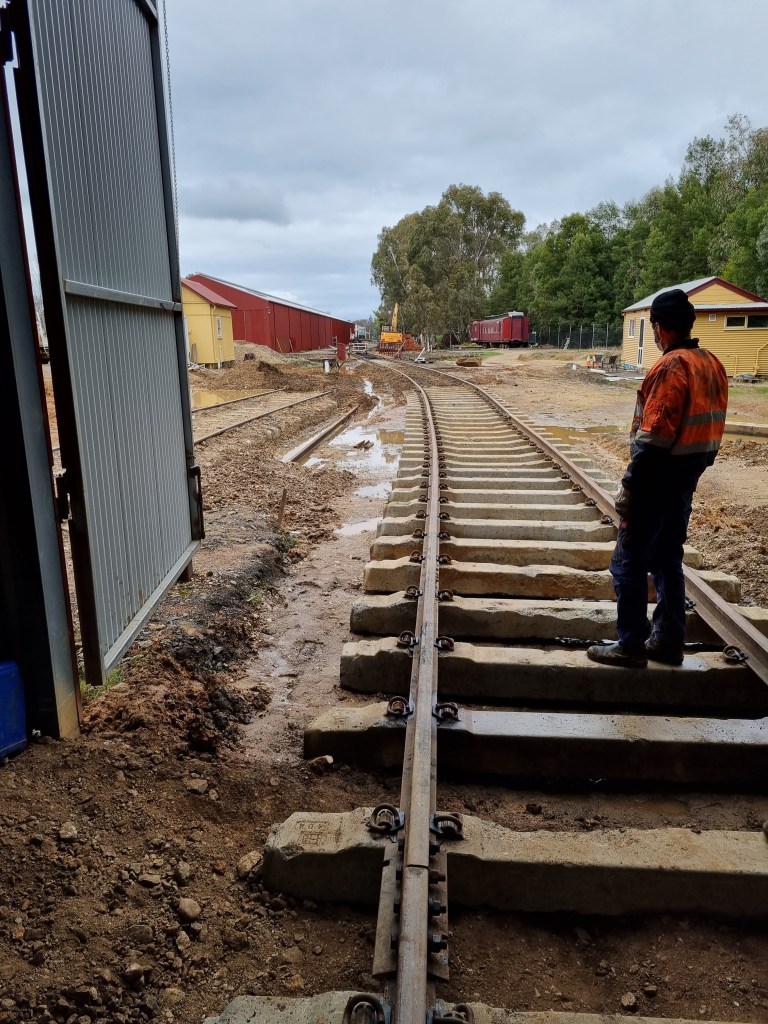 The first job today was completing the trackwork into the loco shed, only a few bolt holes needed drilling and about 15 sleepers were clipped up. It still needs a final line, but until we get some ballaet on it, it’ll keep springing back to where it seems happiest.