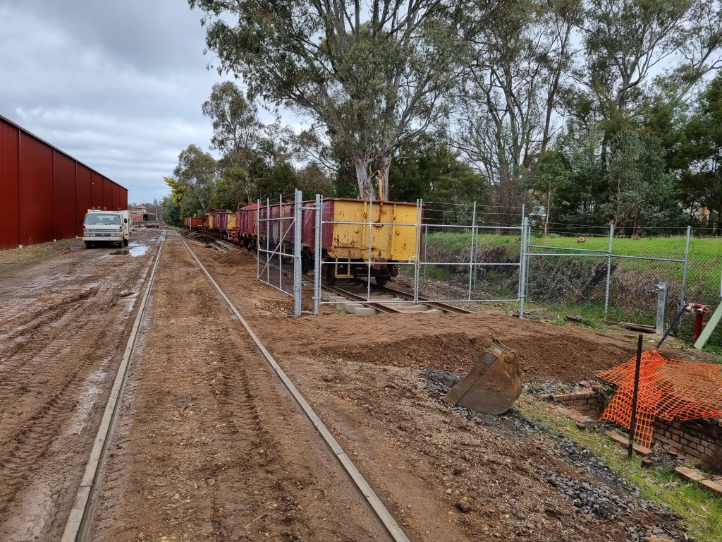 Well, we achieved our goal in a very timely manner today, with the track up to the current compound gates completed, and now in use. It’ll be used as storage for some time until we get around to completing the pit and in turn connecting the track up to the turntable.