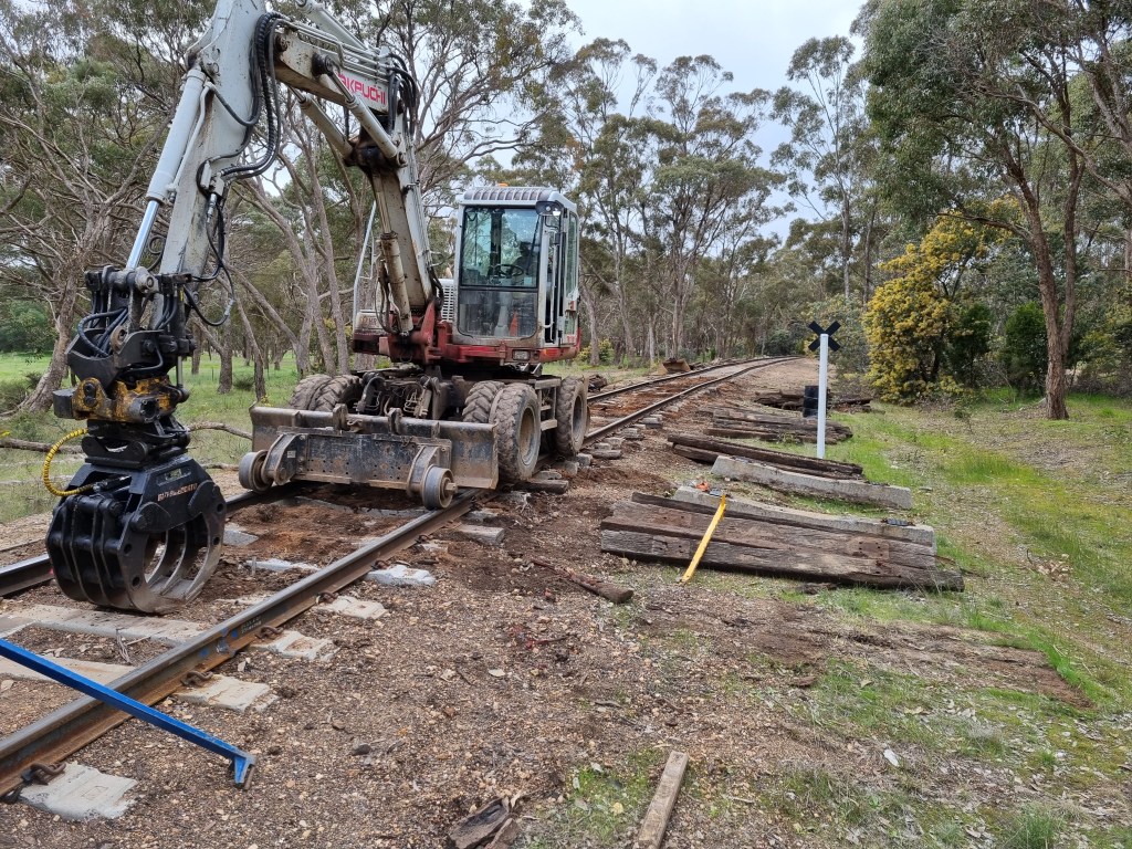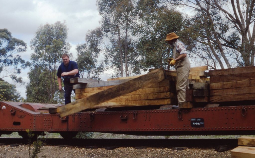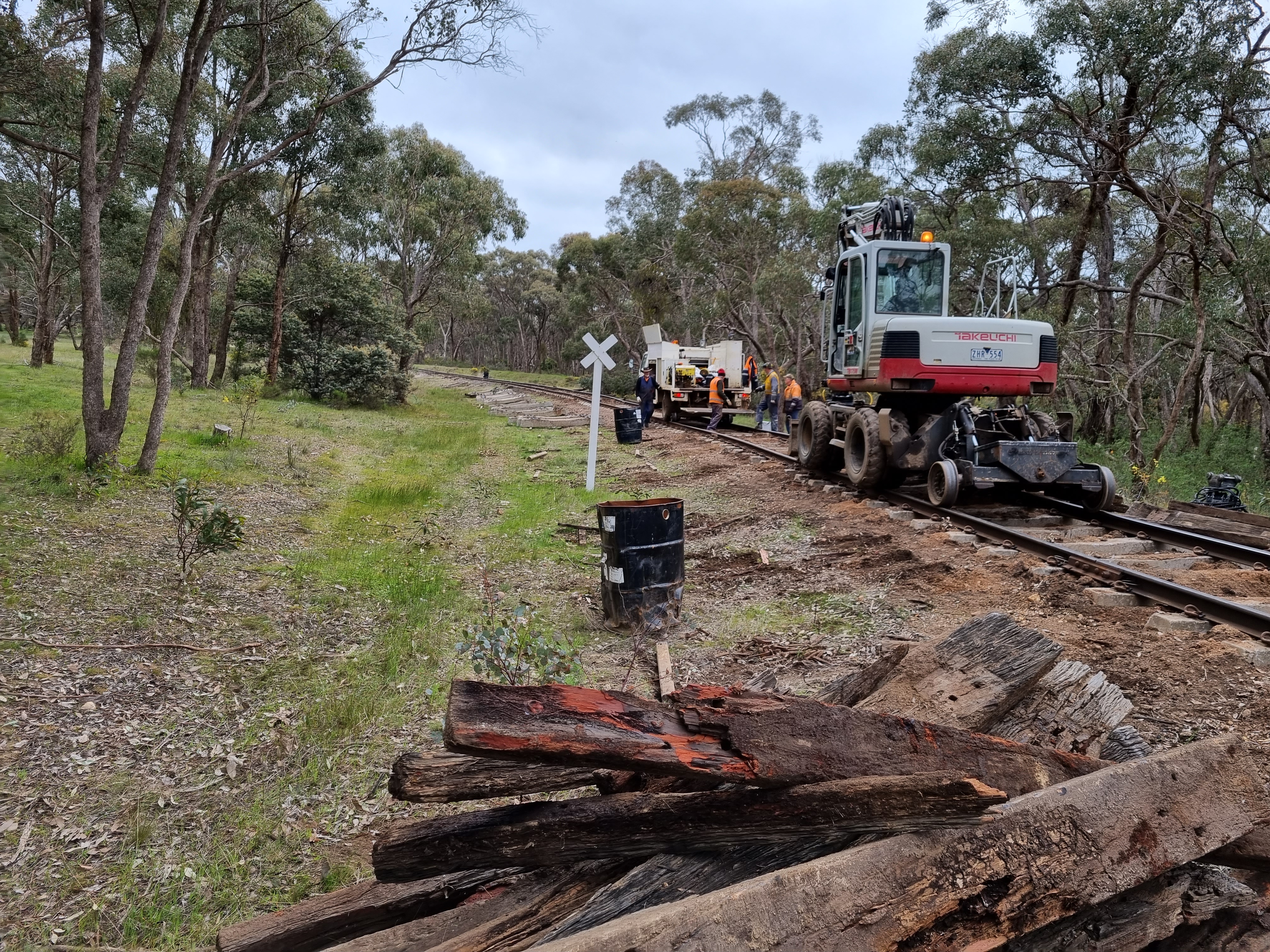 Just as a note re life span of these timber sleepers in our climate, the grey box are weathered and probably about 3/4 of their new size, but still usable (we’ll cascade them into Maldon and Muckleford Yards), the red gum is fully life expired, generally coming out in lumps.