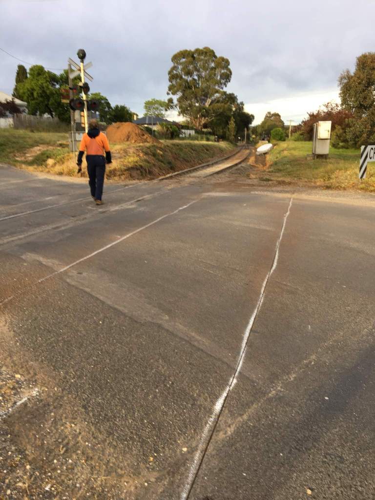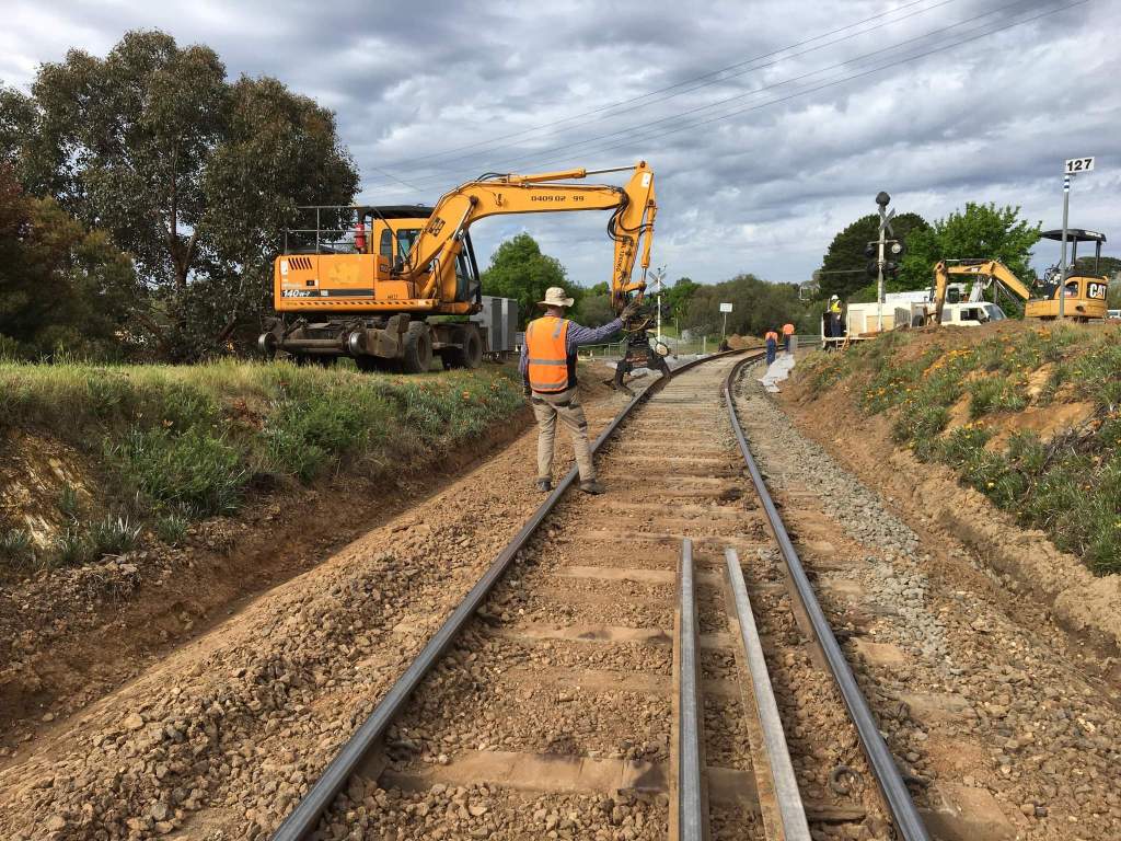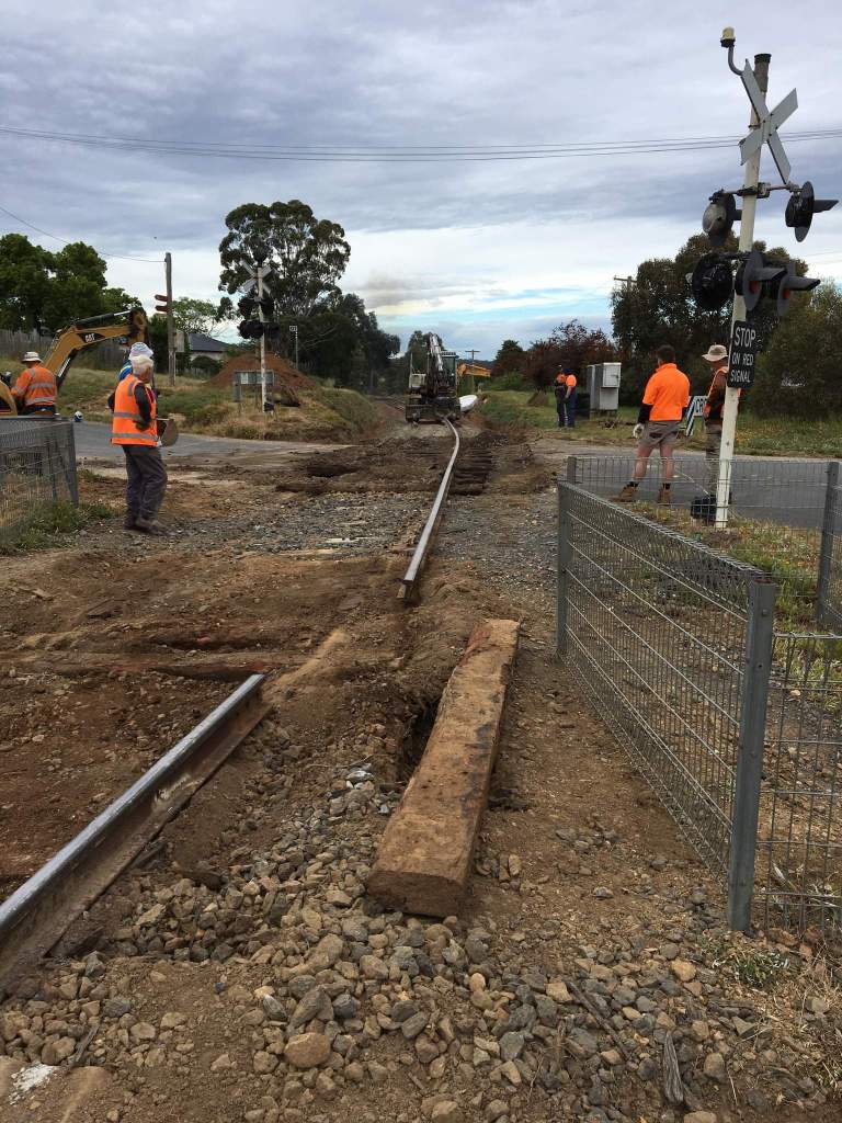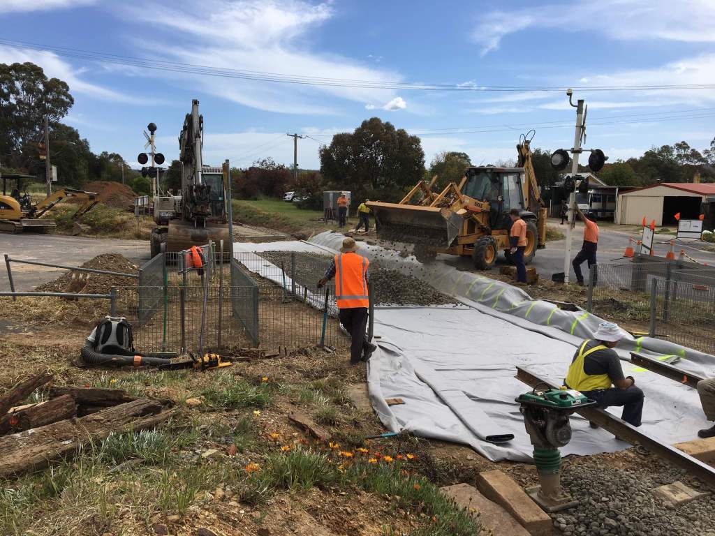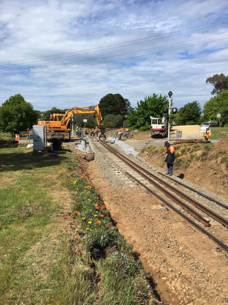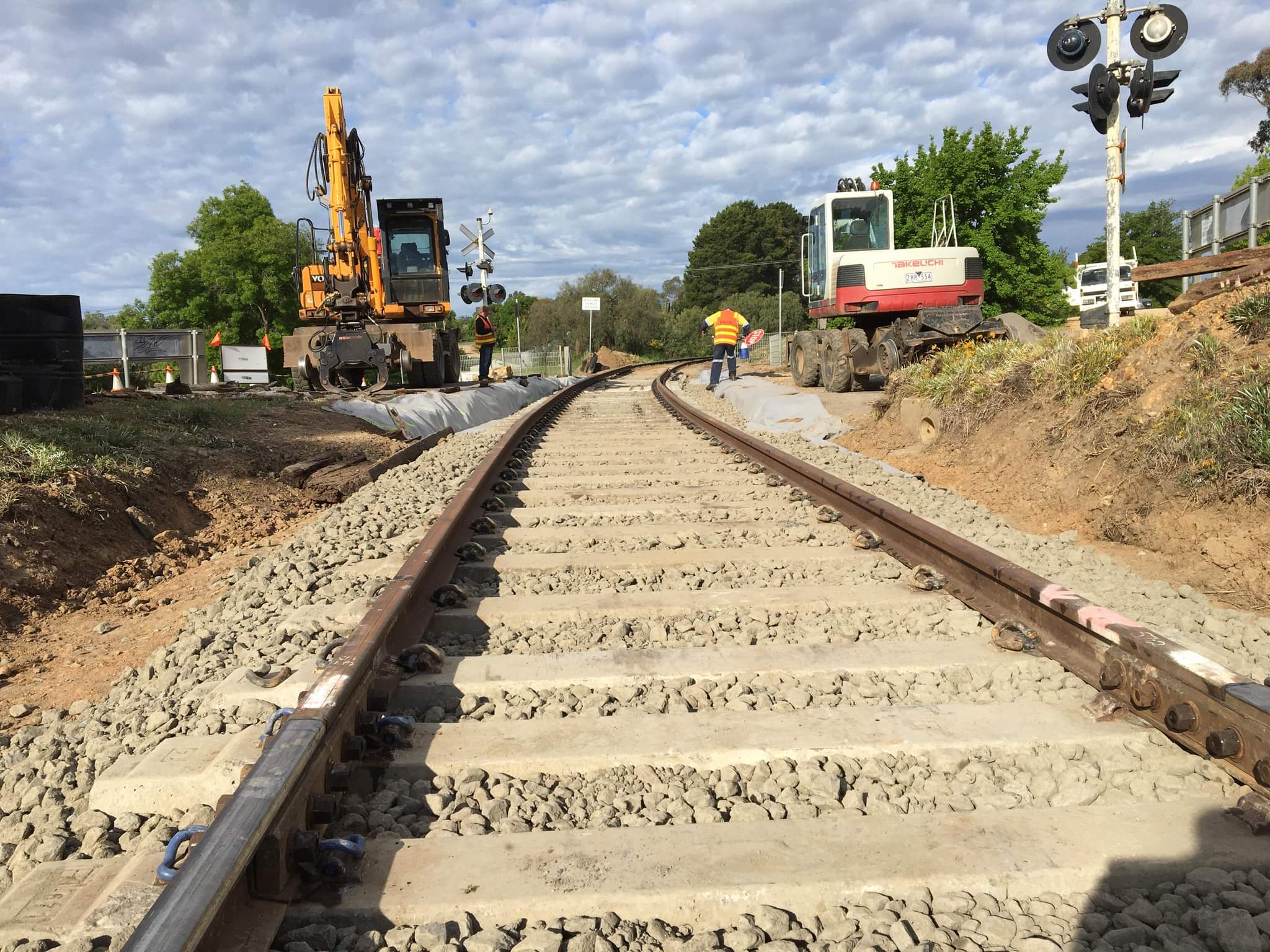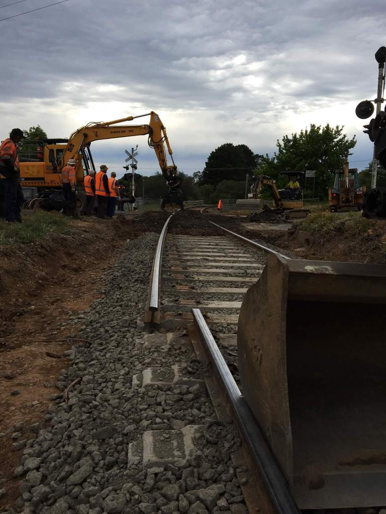 By early afternoon it was roadbase, geofab and drains in, layer of rock spread and sleepers laid out with rails being towed into place. Thankfully we’ve got all the gear for this these days, as it’d be a hell of a job without it!