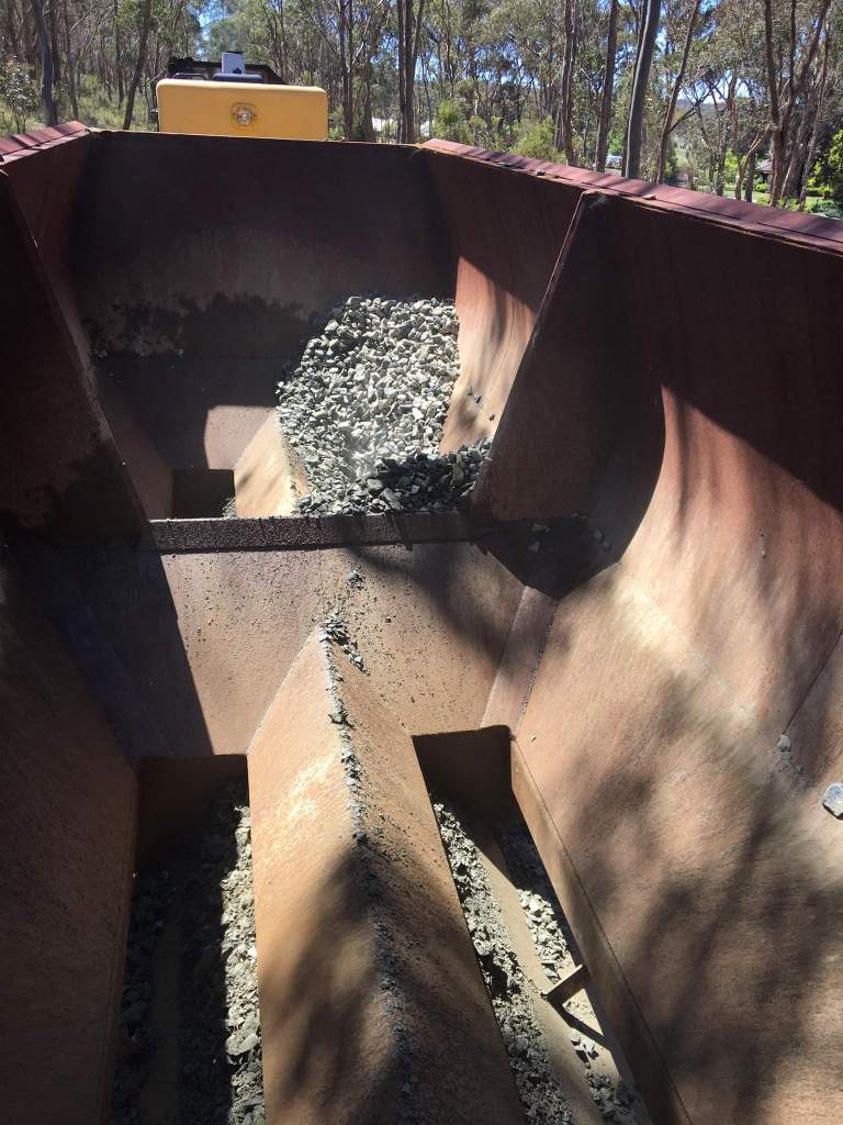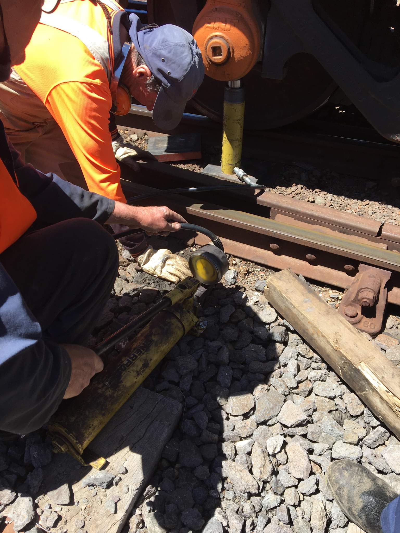 We use a hydraulic cylinder, with a gauge, which we tested on several know weights prior (the Y classes and known carriages etc…). This led us to believe very satisfactorily the wagons weren’t overloaded, which is always a good thing. However it did confirm they were too heavy to go over Pyrenees HWY Bridge, so as planned we were going to have to drop rock before Pyrenees hwy bridge, to reduce the weight.