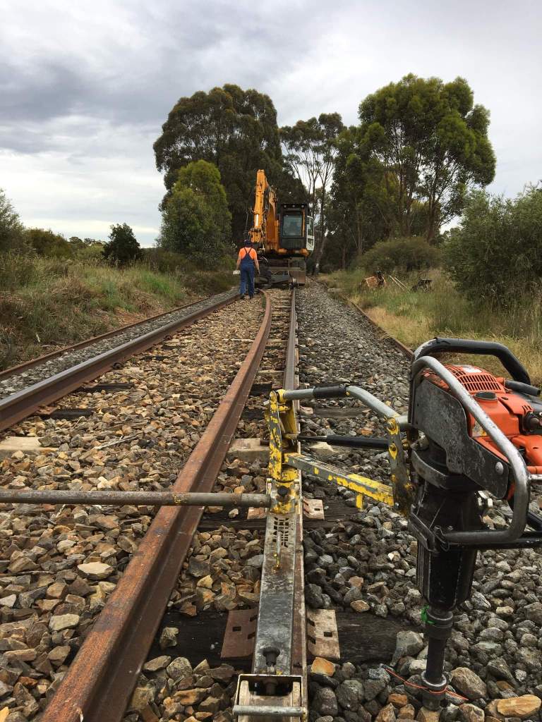 We’ve upgraded to a nice lightweight trolley, got a whole range of rattle guns, made the move from timber to concrete and started using rock ballast – and added a whole raft of diggers and trucks to make work much easier. These pics were taken in the general area of today’s works.