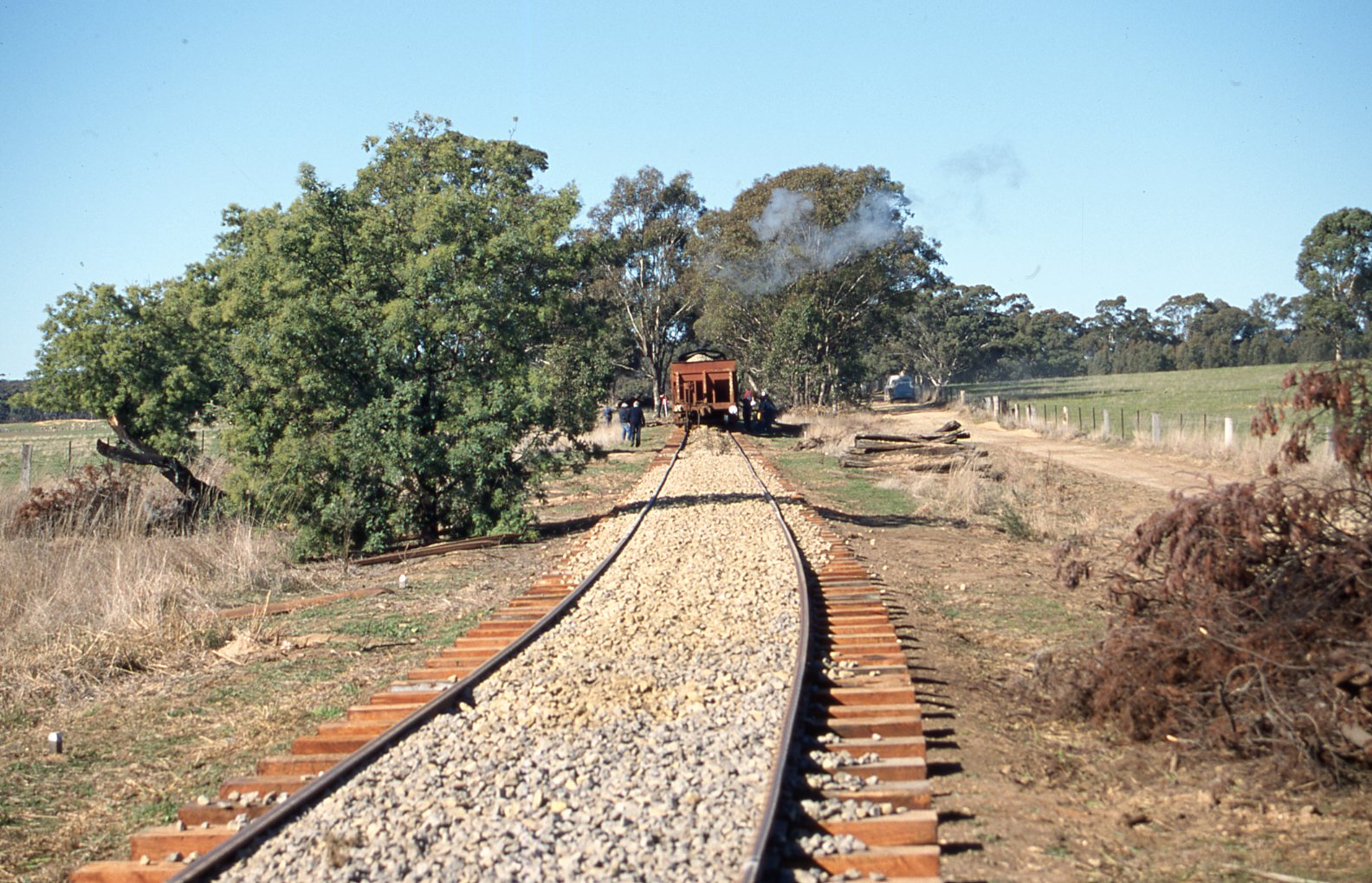 This pic, also from the same collection but several months later in July 2002. The first train on the rebuilt track is discharging ballast, the front of the train is roughly where we started work re-railing today. It’s not unrecognisable today, but the changes are significant; 1 in 3 sleepers are concrete, the rail is now long lengths of 94lb with a quite impressive ballast shoulder to match.