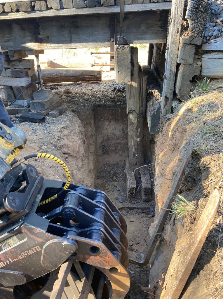 A nice easy lift in for the little digger, since we’ve changed to using grabs, the days of trying to crane in the piles with chains and guide ropes are gone, taking what was a three or four person job into a one digger and one spotter job.