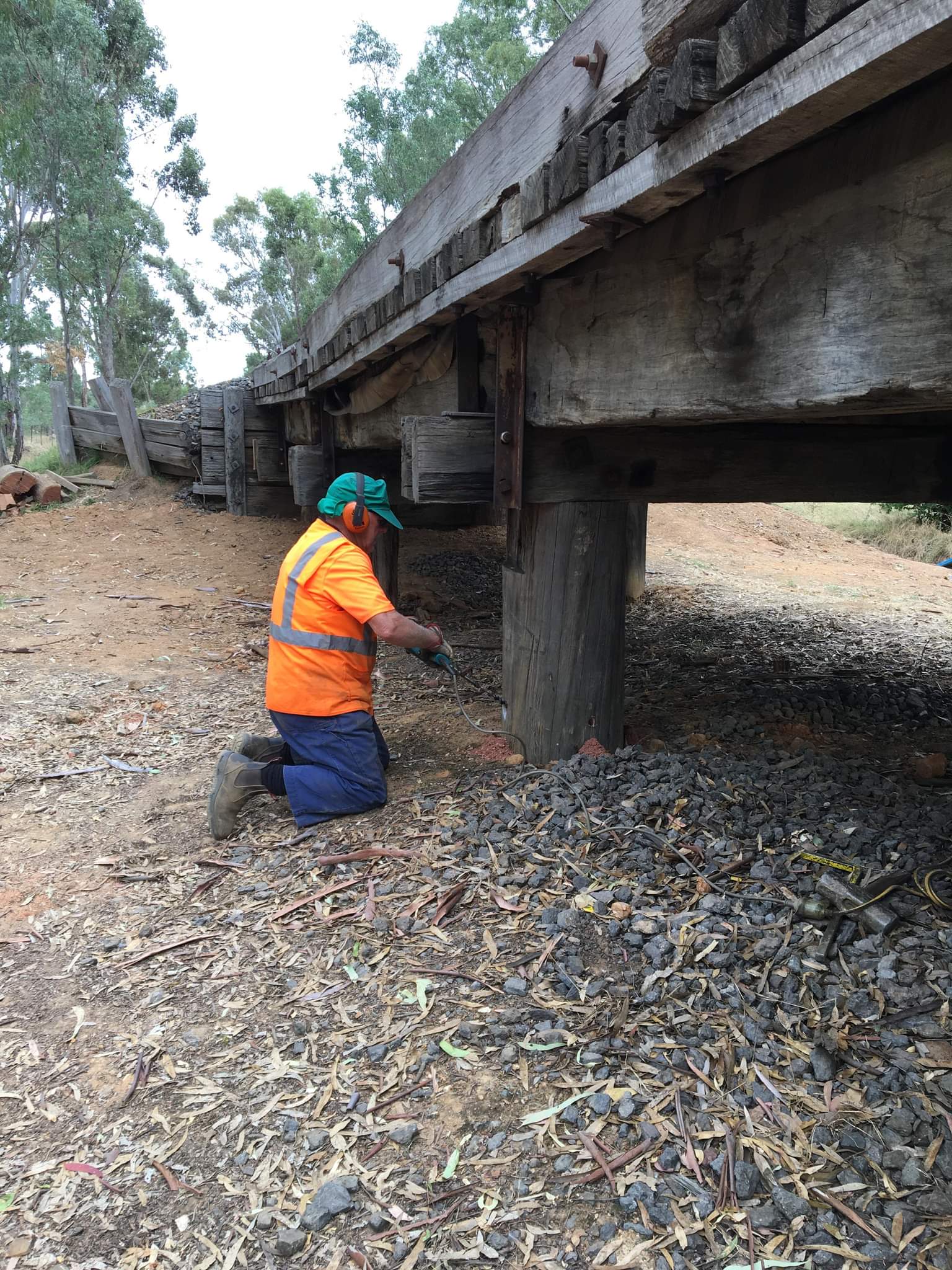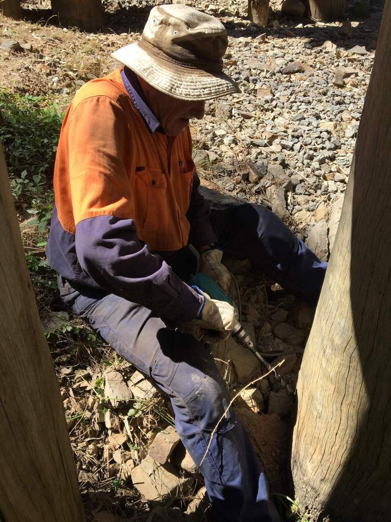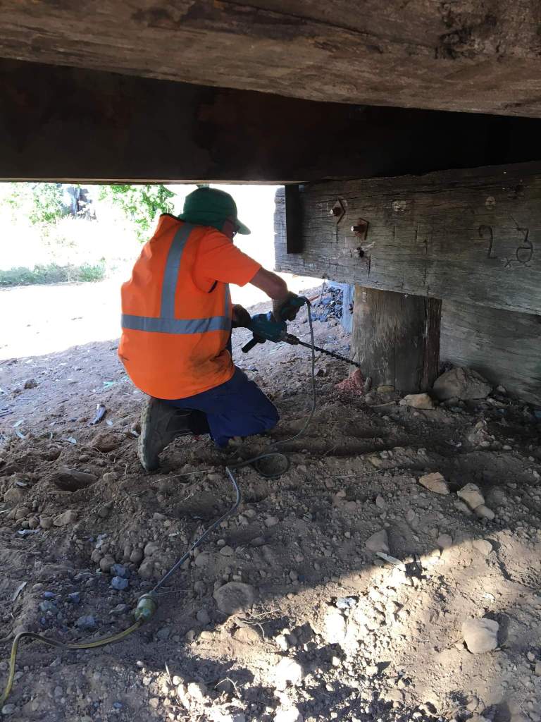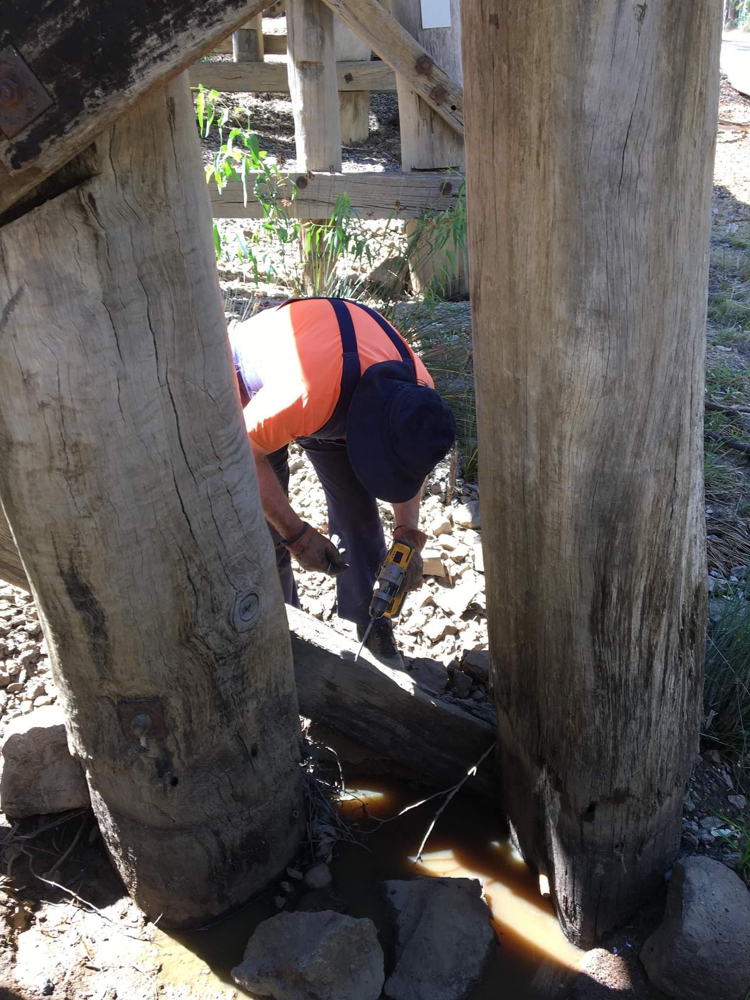 Well anti-termites really. Today was about installing and renewing the chemical stick termite treatment into Muckleford Creek Bridge.