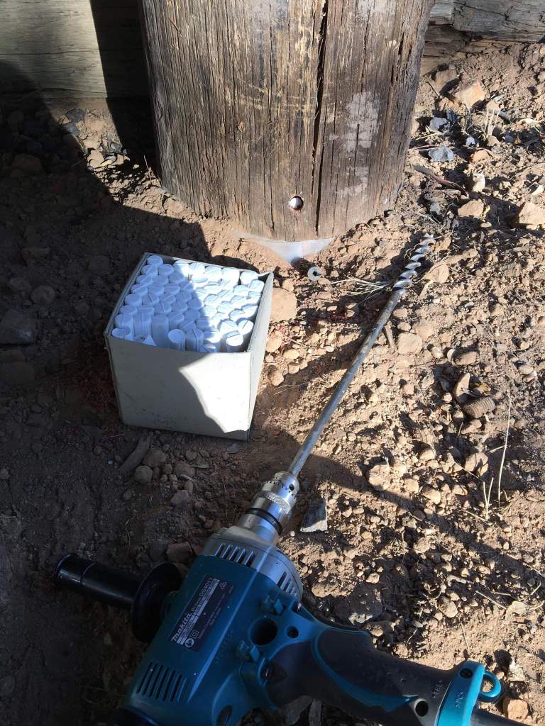 It’s quite a simple process, whereby a few small holes are drilled into each pile, as many sticks as can be shoved down the hole are and a plastic plug is installed to keep them dry and in place.