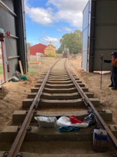 On Friday we connected the track from the turntable to A Bay in the Loco Shed – almost ready for locos.