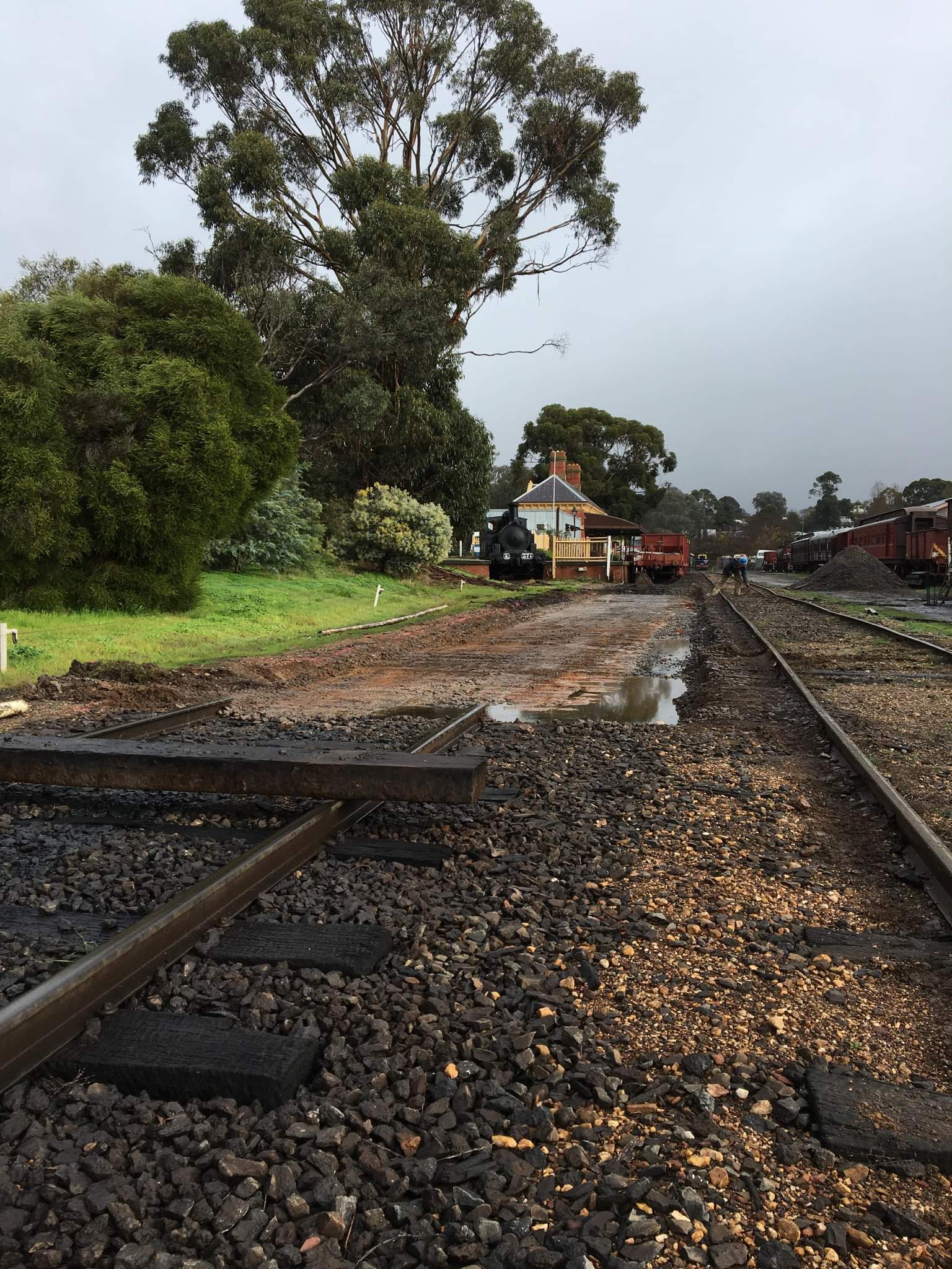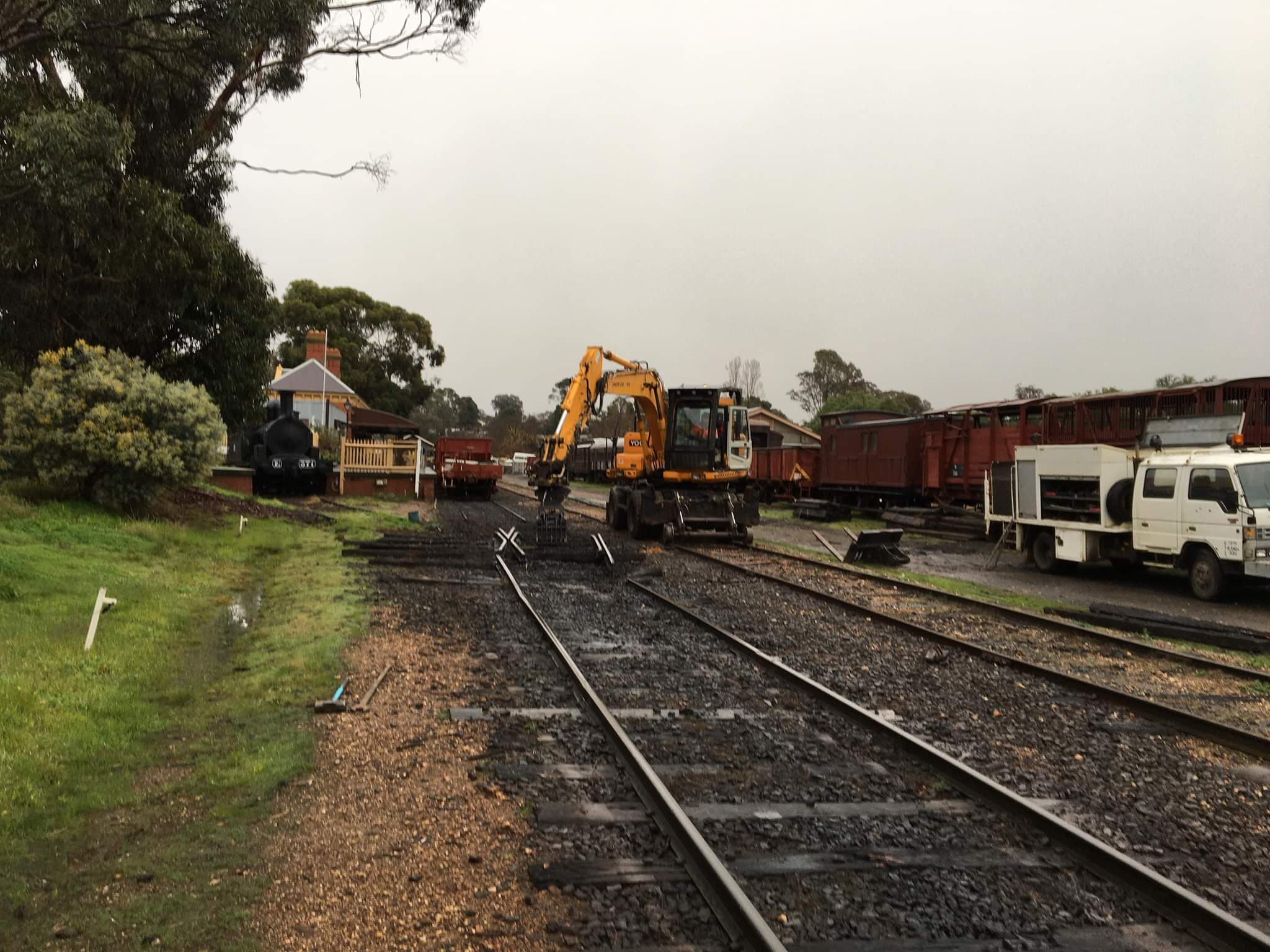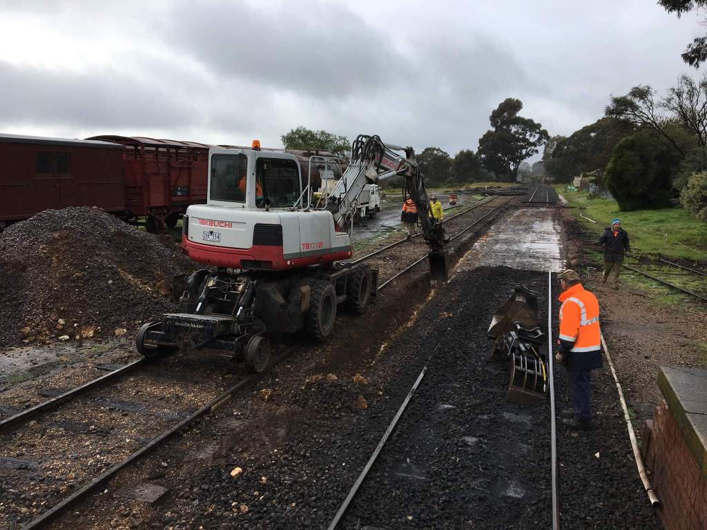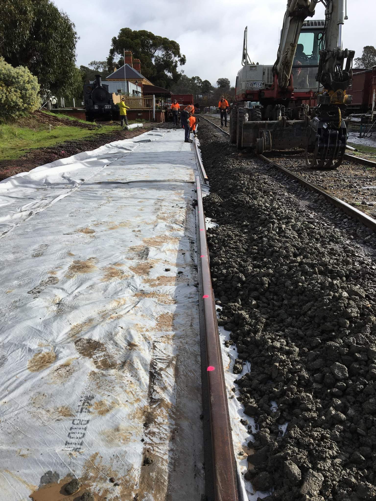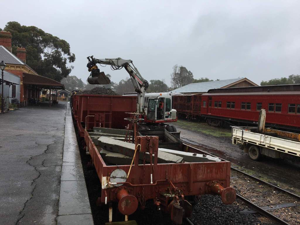A keen eye will note a ballast train stabled in the platform, this was brought up last night by the light engine move. We’ll need that tomorrow to ballast the new track, but we also needed it today to access a bit of rock to cover the drainage pipe.