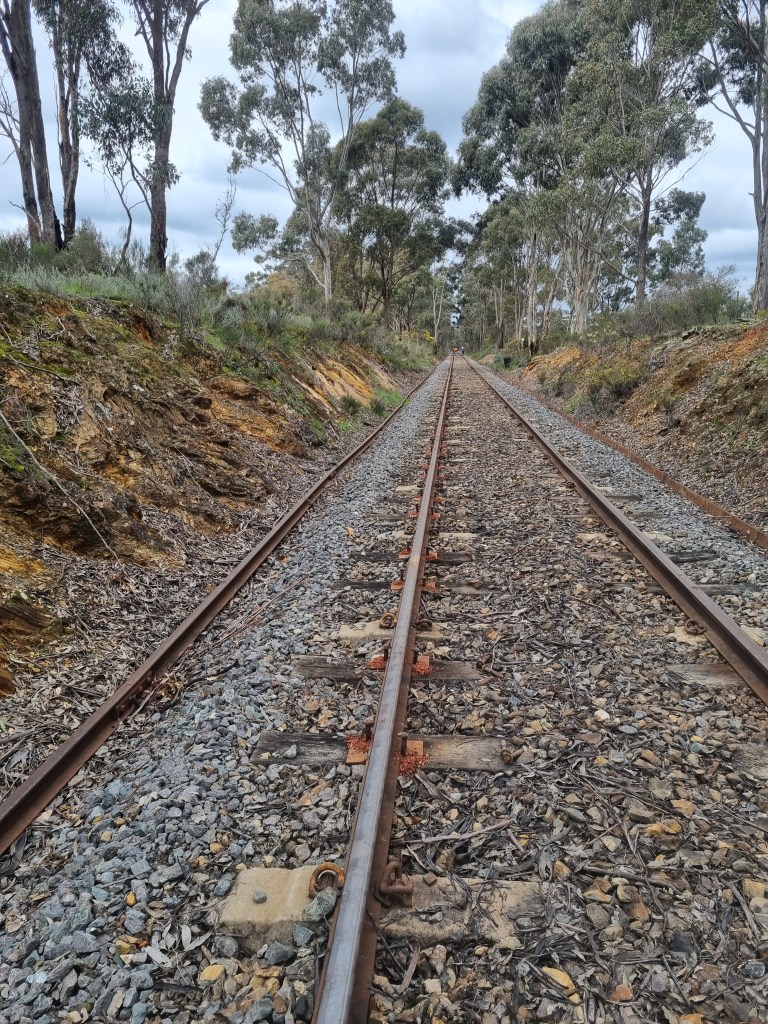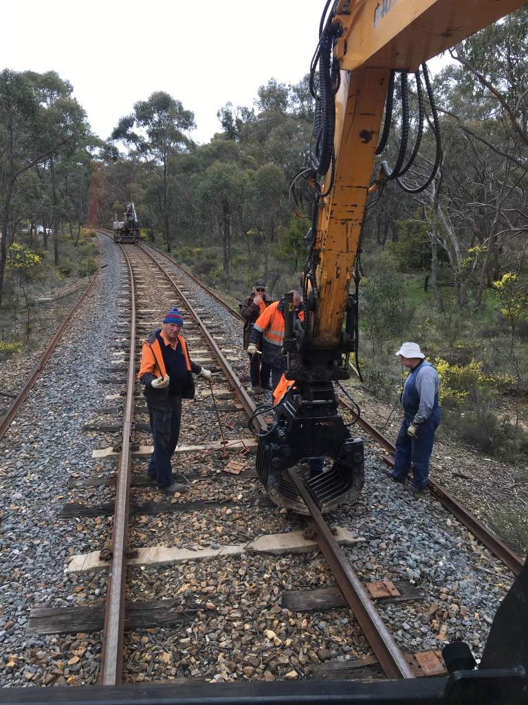 About 1.5kms worth of plates were inserted under the track, starting at tangent 11-12 and finishing up at curve 10, so far only in one leg. The big digger would lift, while the plates were slid under, the little digger followed along behind doing a tamping pass to firm everything up and prepare for driling.