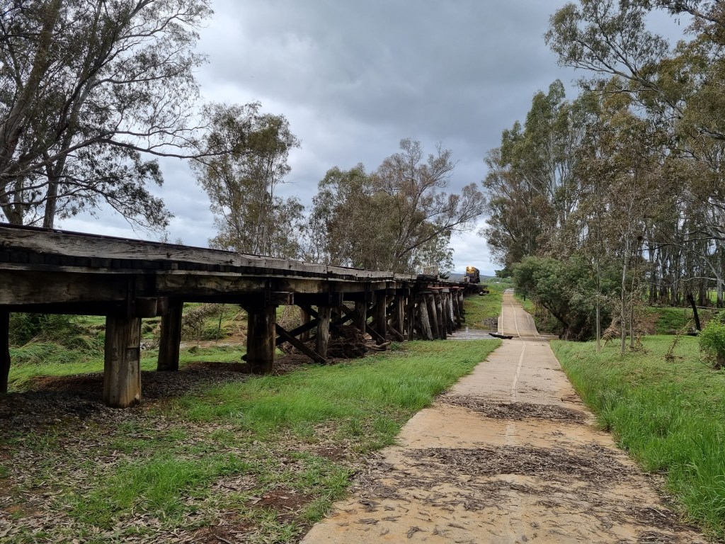 The flow at Muckleford Creek reached places it hadn’t for a very long time, and would appear to have saturated some of the usually very dry areas. The saturation has led to one pile settling a little further, around 6mm (when under load, we made use of the T class doing another of its test runs) more than previously, so we’ve placed a temporary speed restriction over the bridge until it dries out enough next week to get in and place some additional packing in to level the bridge back up. It’s really just routine maintenance and a result of some very very wet ground!