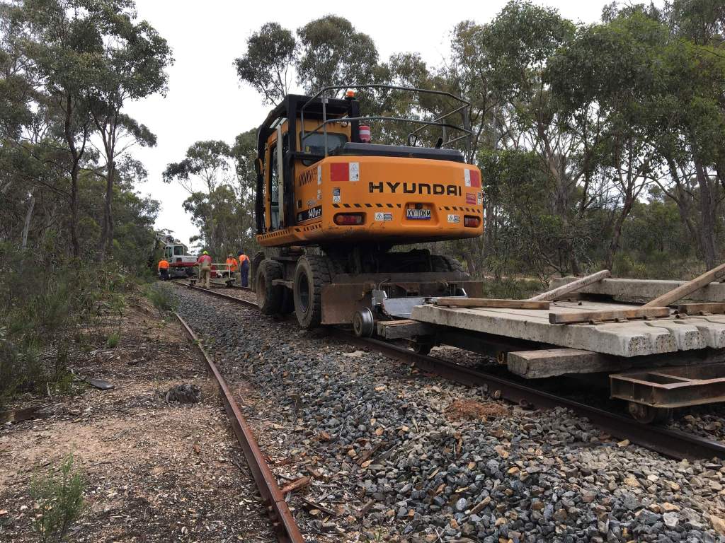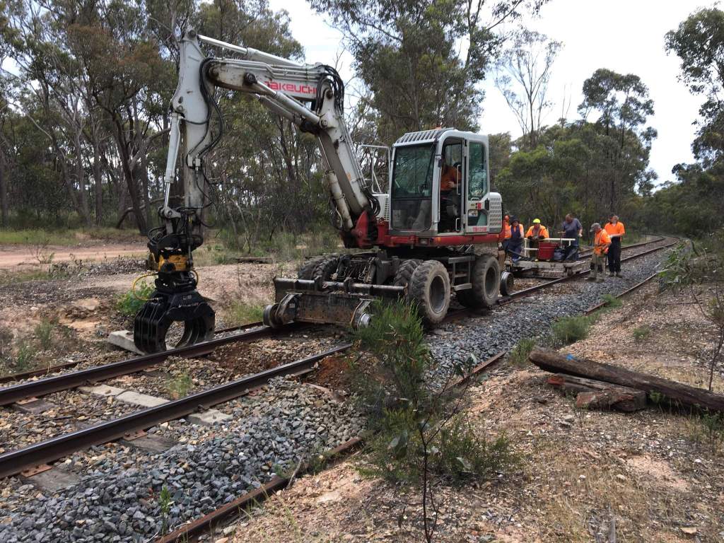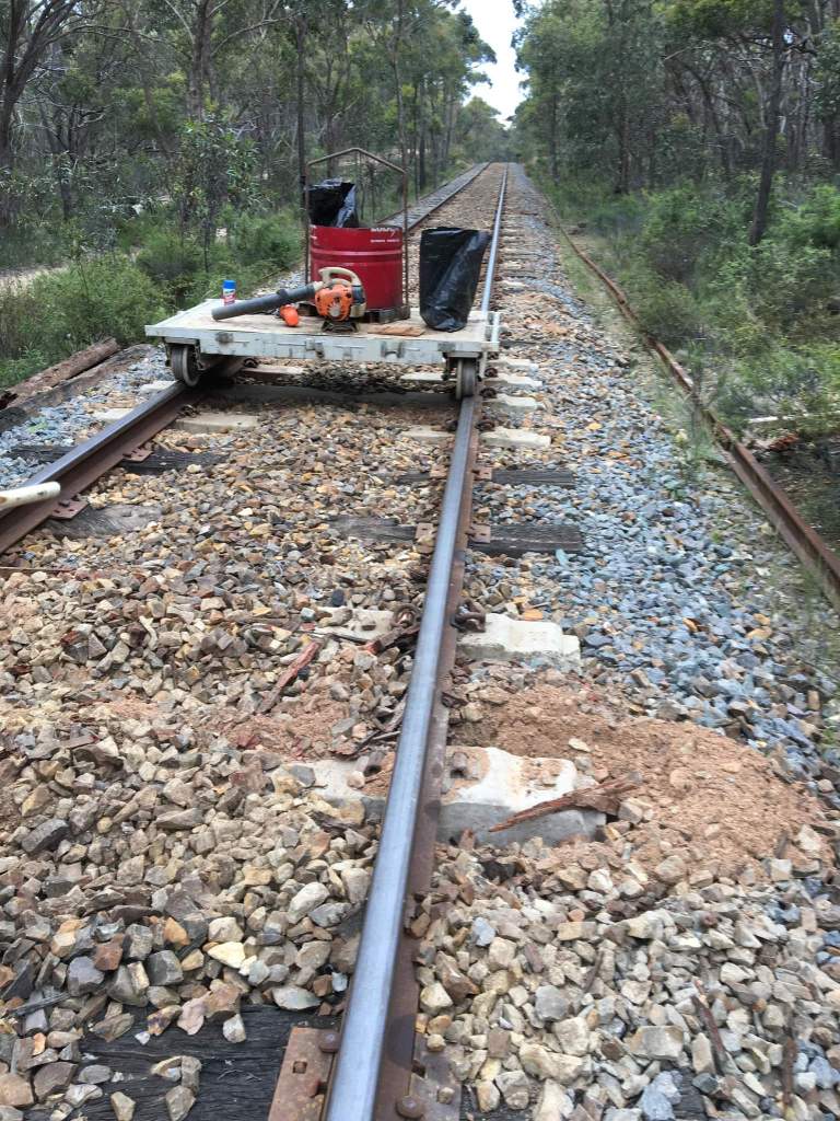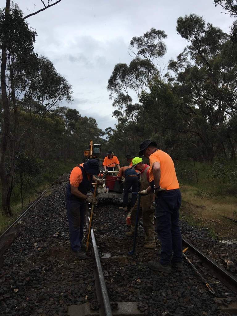 An extremely successful day of inserting and clipping up concrete sleepers. We’re yet to do the actual count, but it’s around the 80 sleepers mark, with everything from Curve 10 to Sawmill Rd now complete.