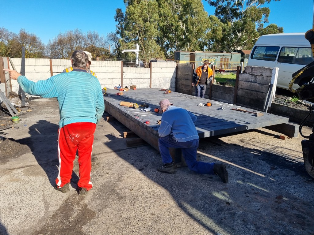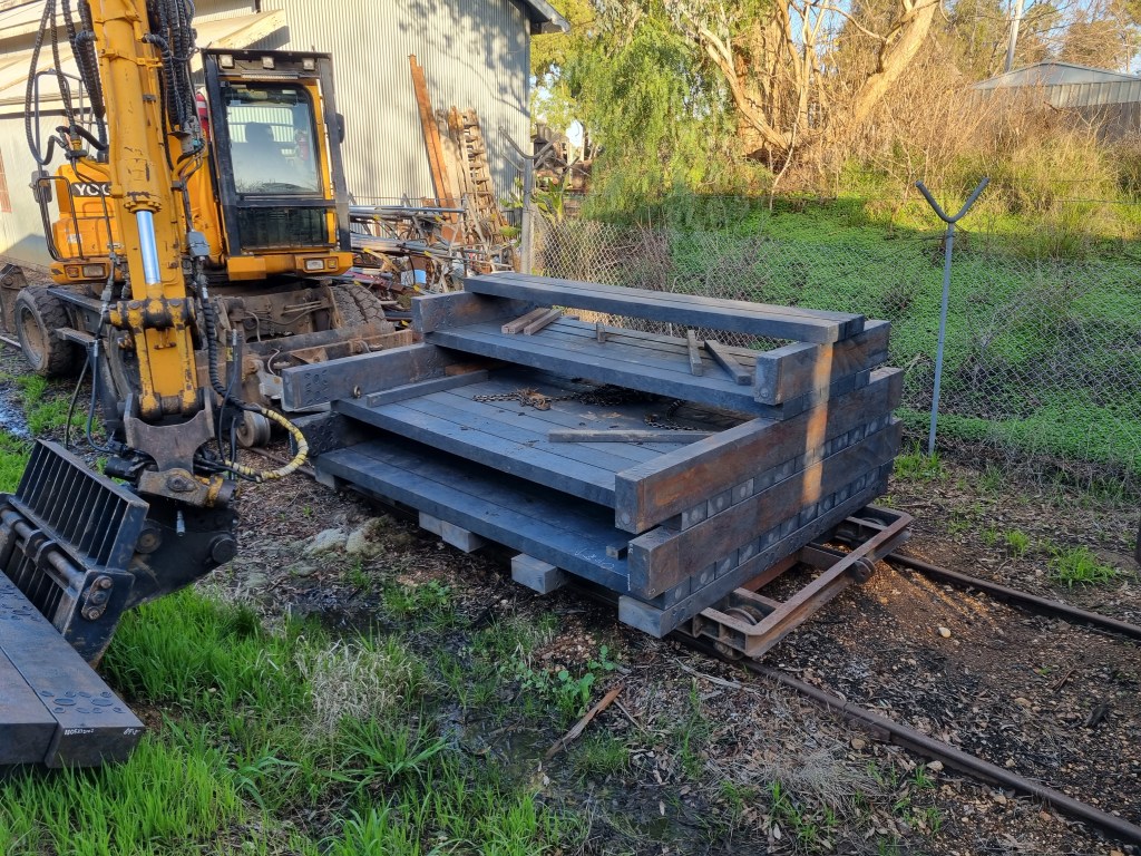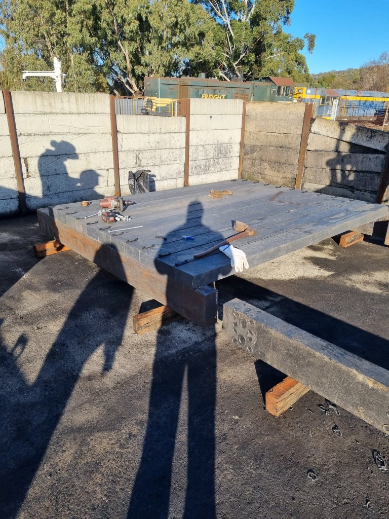 It’s been assembled in 3 sections, stacked onto a trolley, ready for taking out to site next week. The trial bridge will be Muckleford Creek, given its decking is due for renewal in the next few years. We’ll undertake the rest of the assembly on site, late next week, with Tuesday’s gang preparing the bridge for the swap.