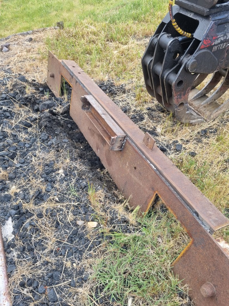 It’s a ballast scrapper, set to the exact height of a full depth concrete sleeper. The idea being well lift the rail 150mm, remove the old sleepers and use this to sit on the rail head and allow a level ballast/gravel base to be made for the concrete sleepers going in. The extra large cut outs are to clear fishplates.