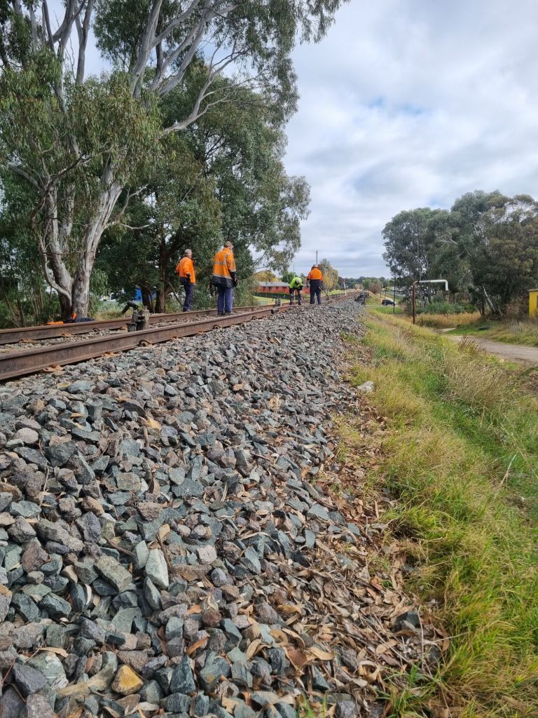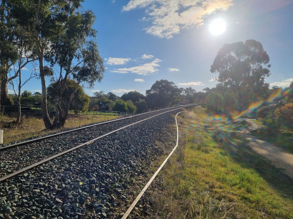 With the low sun, the bright ribbons of steel were very visible from up by Midland Hwy Crossing as we re-installed the 25mph speed board, now able to lift the 15mph restriction over this small stretch. It looks quite impressive we must say.