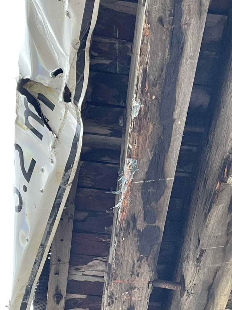 This was the main point of impact, thankfully only superficial marks. However, it has knocked a bit off the beams, so their lifespan has reduced as any odd shaped hole or scratch increases the surface area and in turn means more area for decay.