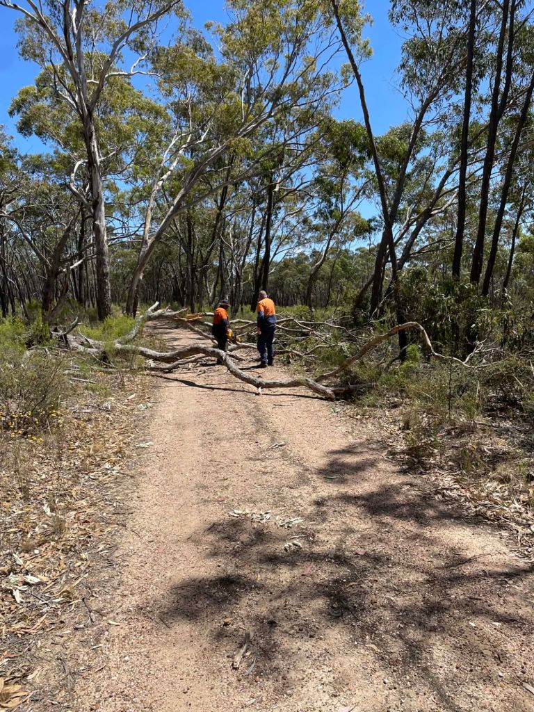 Cut up a tree that had fallen over roadway near donkey farm track.